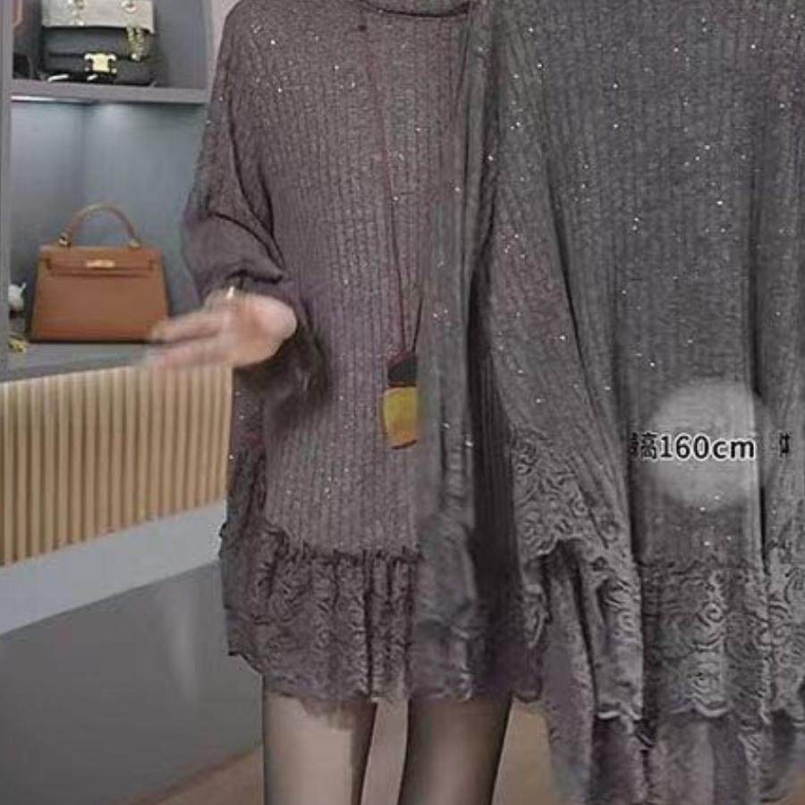 高领蕾丝下摆针织衫女冬季新款慵懒风宽松套头中长款减龄打底毛衣