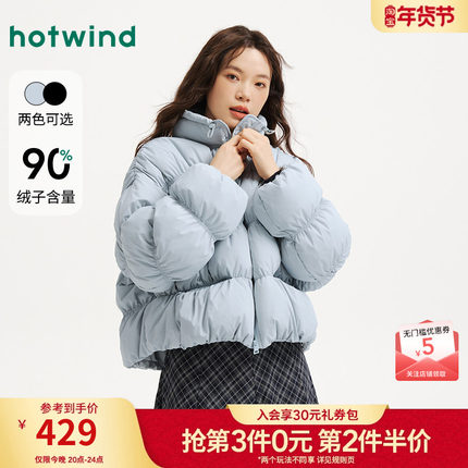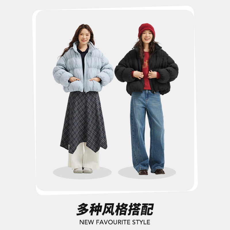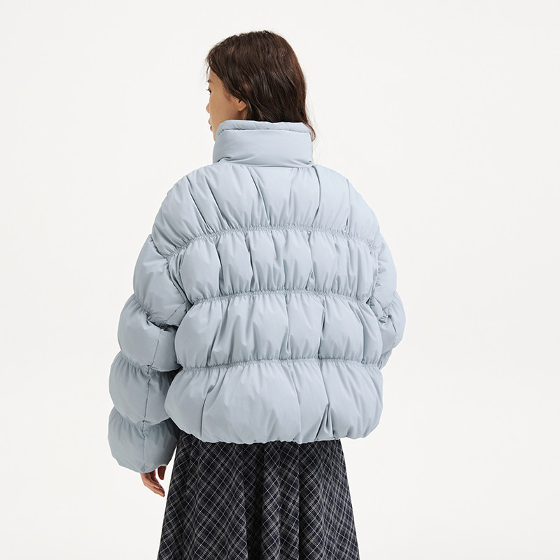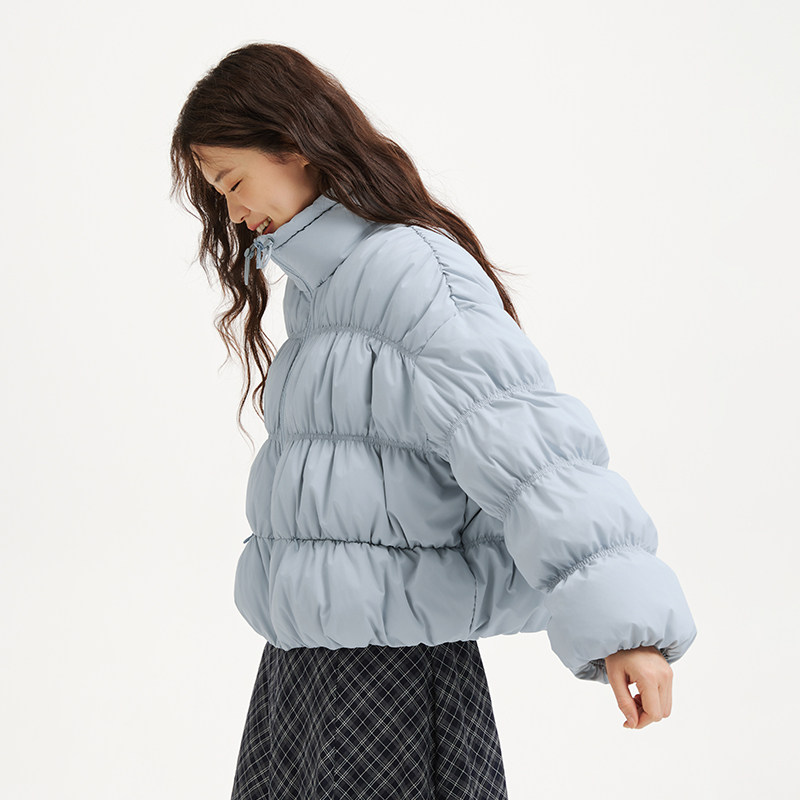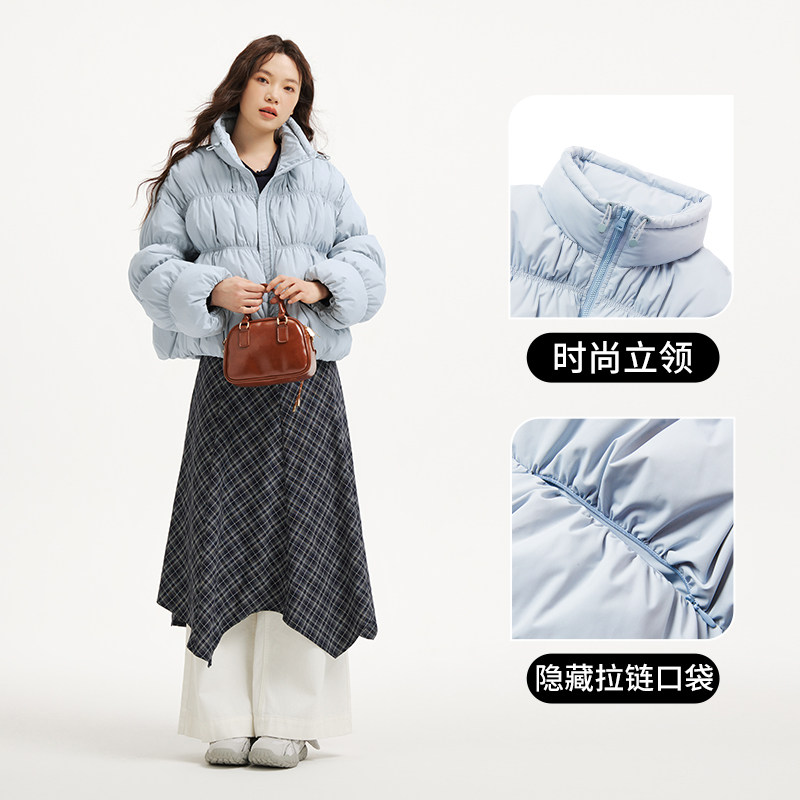 热风女士立领羽绒服2025年冬季新款时尚松紧抽褶收腰显瘦羽绒服