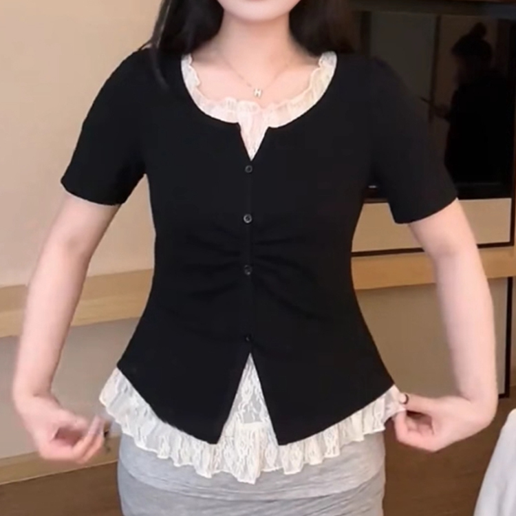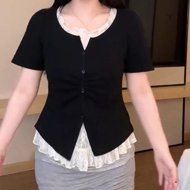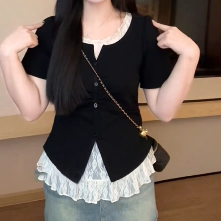 辣妹蕾丝拼接假两件短袖T恤女夏季新款遮肉显瘦洋气百搭小众上衣