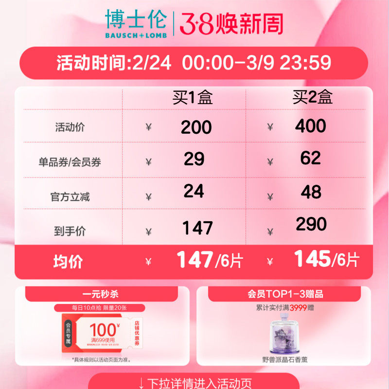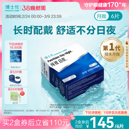 博士伦硅水凝胶纯视日夜进口舒适氧近视隐形眼镜月抛官方旗舰正品