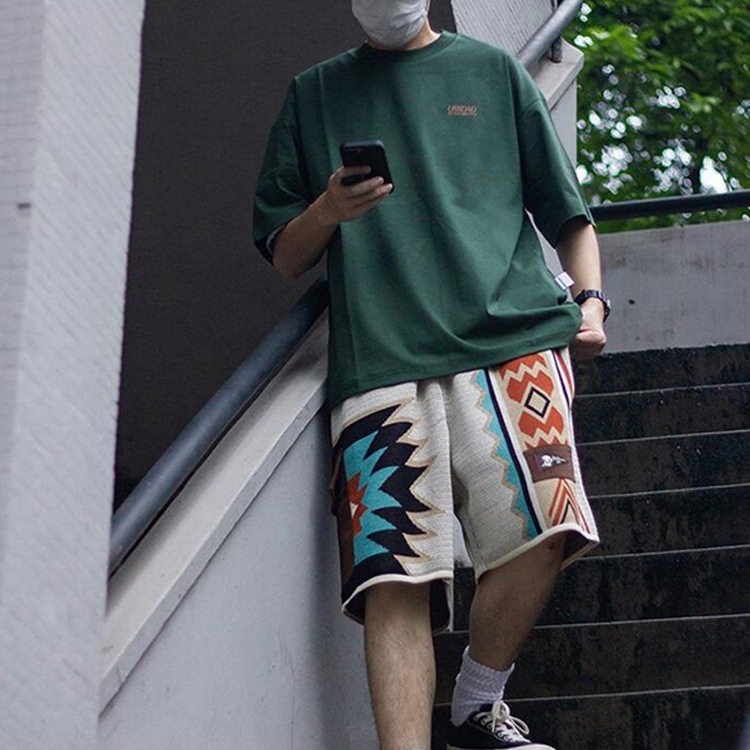 美式复古纳瓦霍针织刺绣短裤男夏