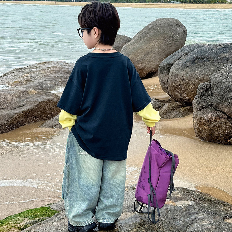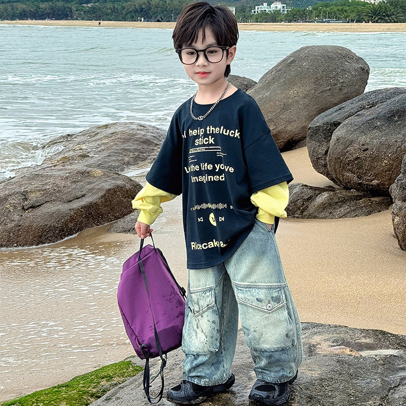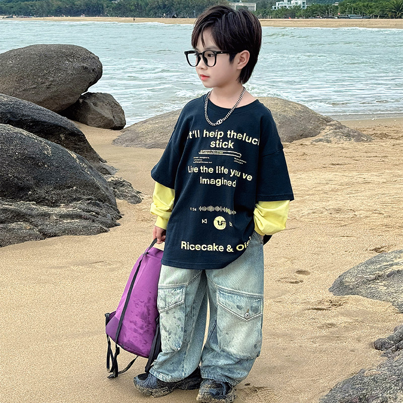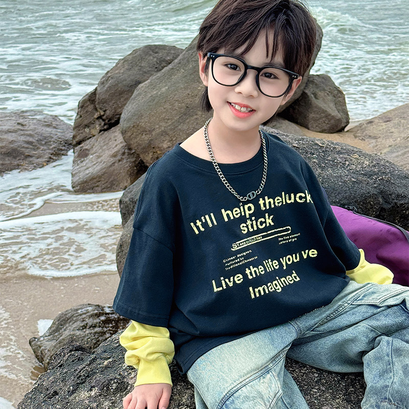 男童T恤春秋款2025新款儿童秋装假两件长袖打底衫男孩秋季上衣潮