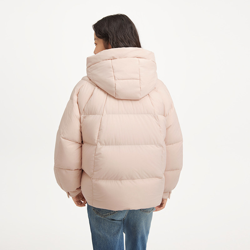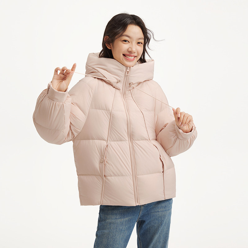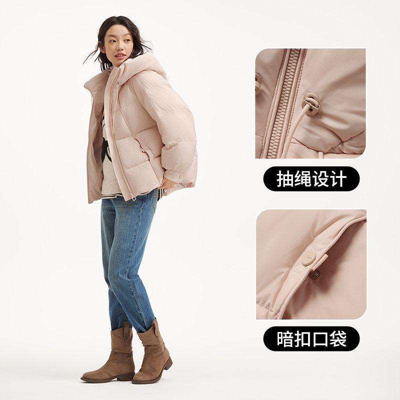 热风女士短款连帽羽绒服2025年冬季新款甜美连帽短款泡芙羽绒服