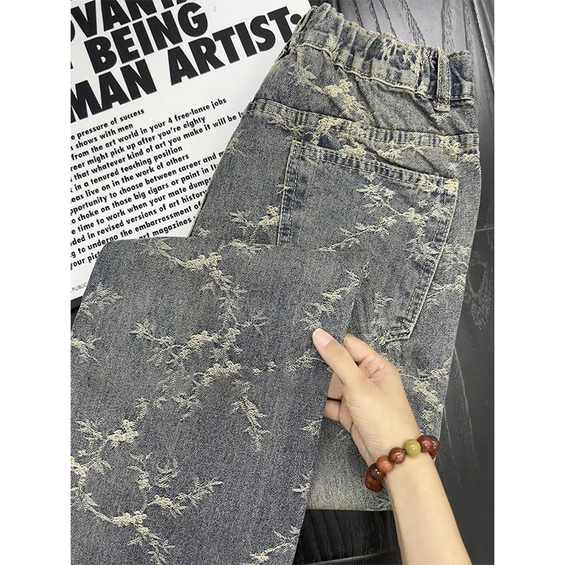 提花刺绣微喇牛仔裤男生设计感穿搭美式高街裤子修身显瘦直筒长裤