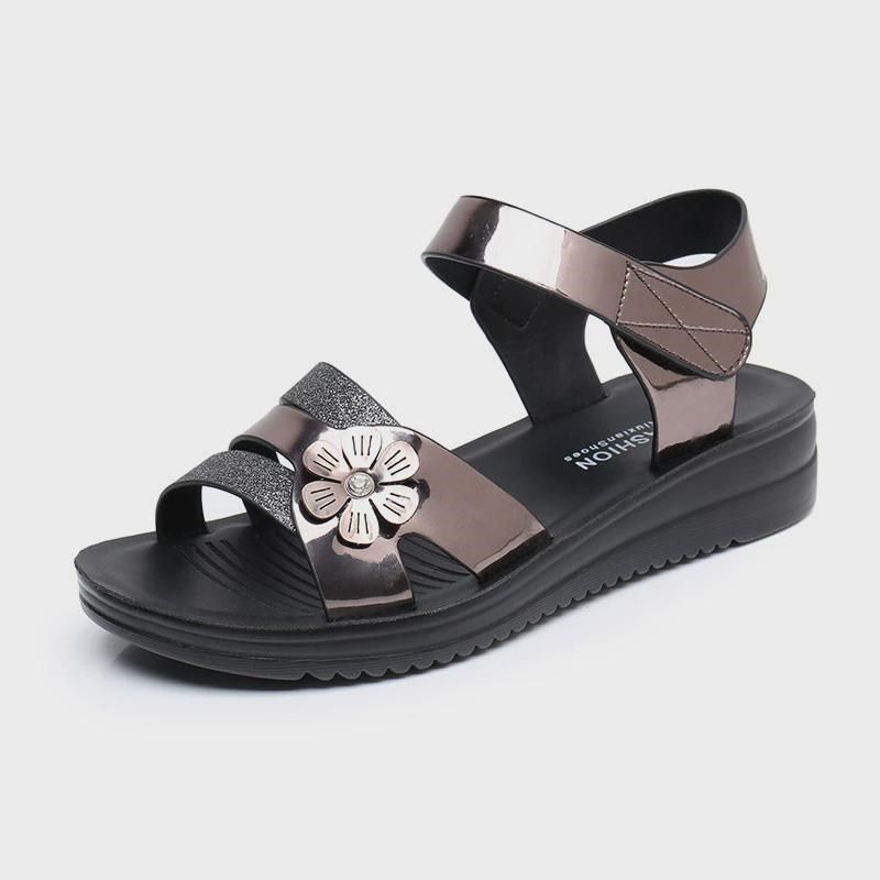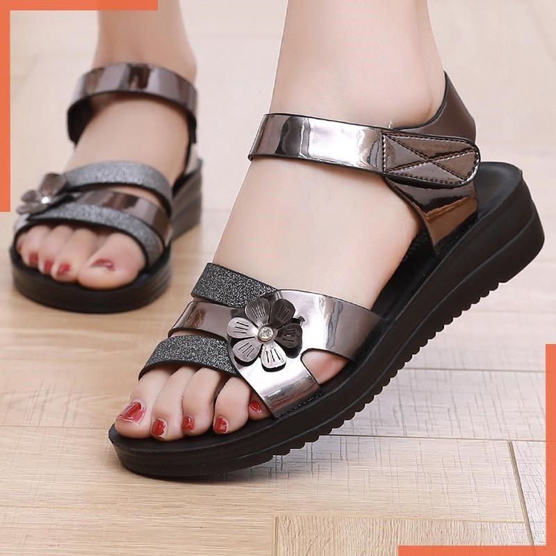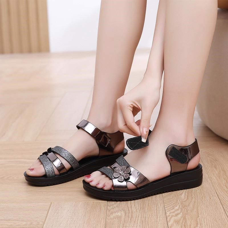 新款时尚妈妈凉鞋女平底软底夏G季中老年女鞋老人凉拖现货