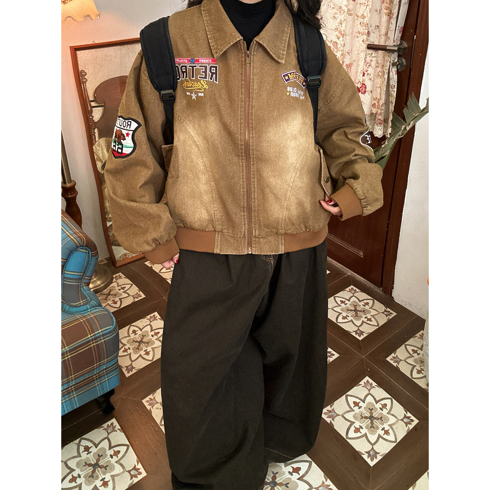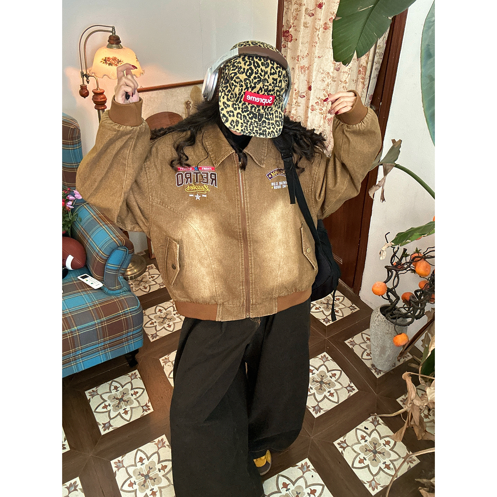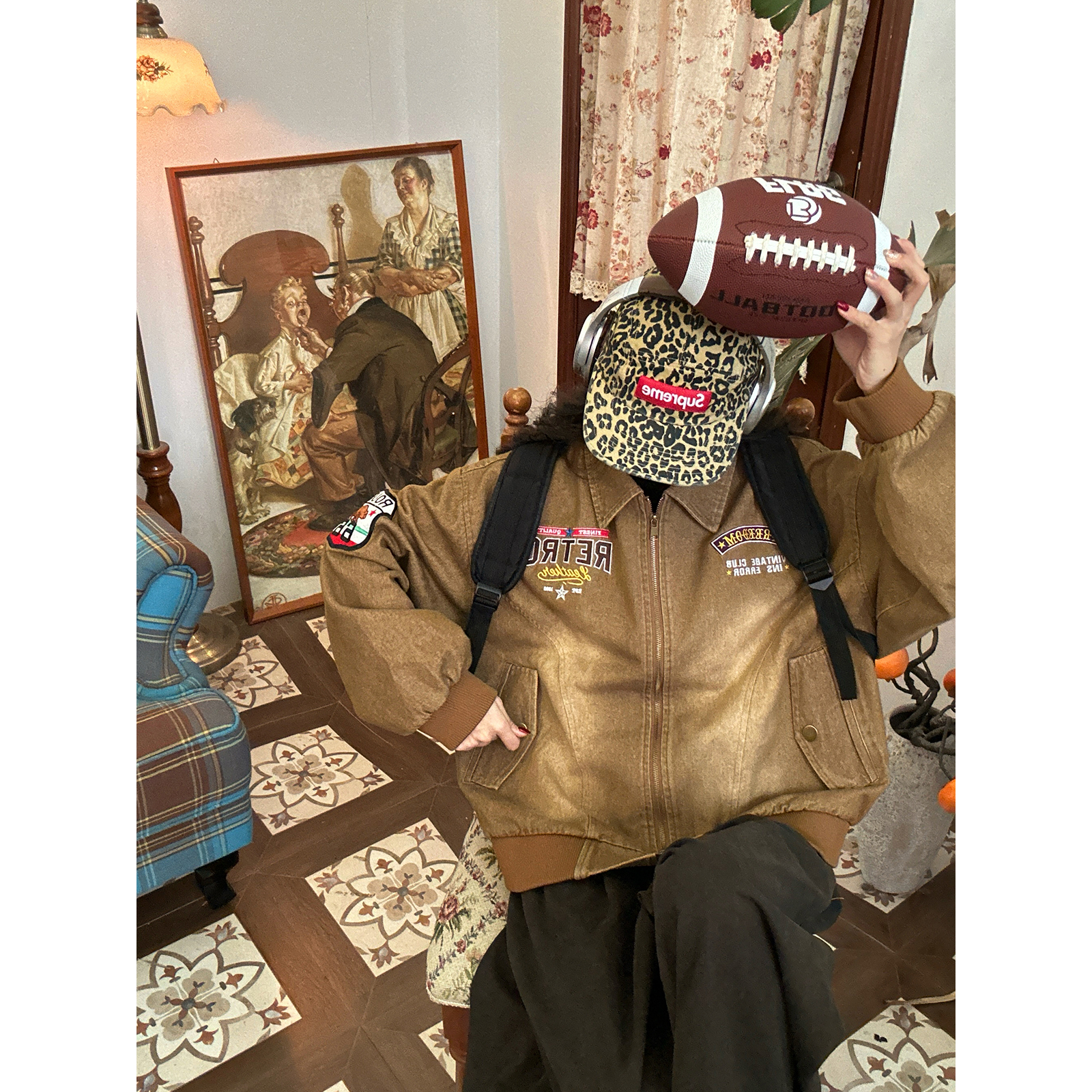 C2自制/美式复古水洗做旧翻领飞行夹克外套男女潮酷宽松短款外套