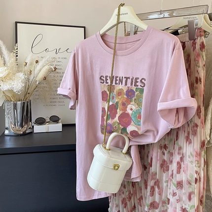 复古字母花朵晕染油画风格纯棉短袖T恤女 夏季宽松白色粉色体恤薄
