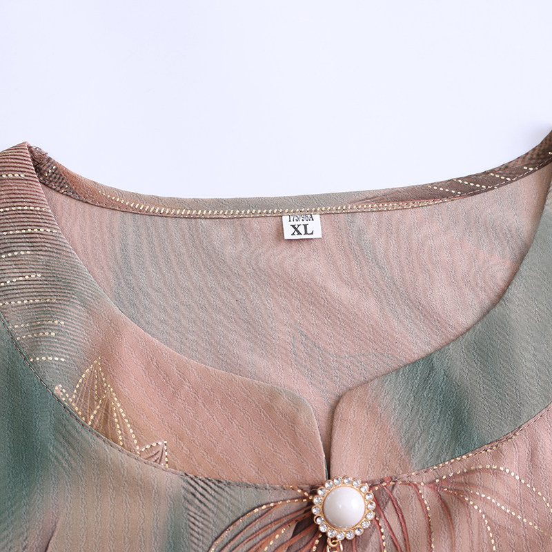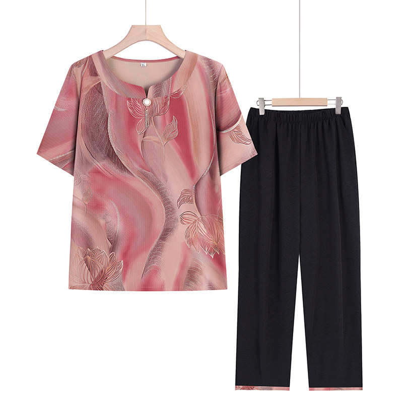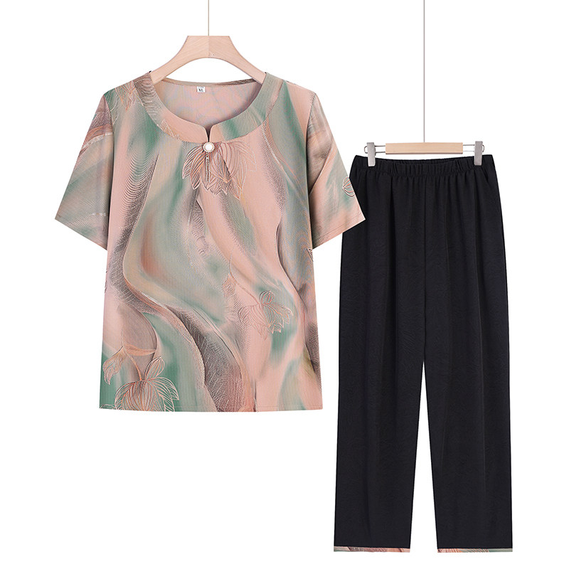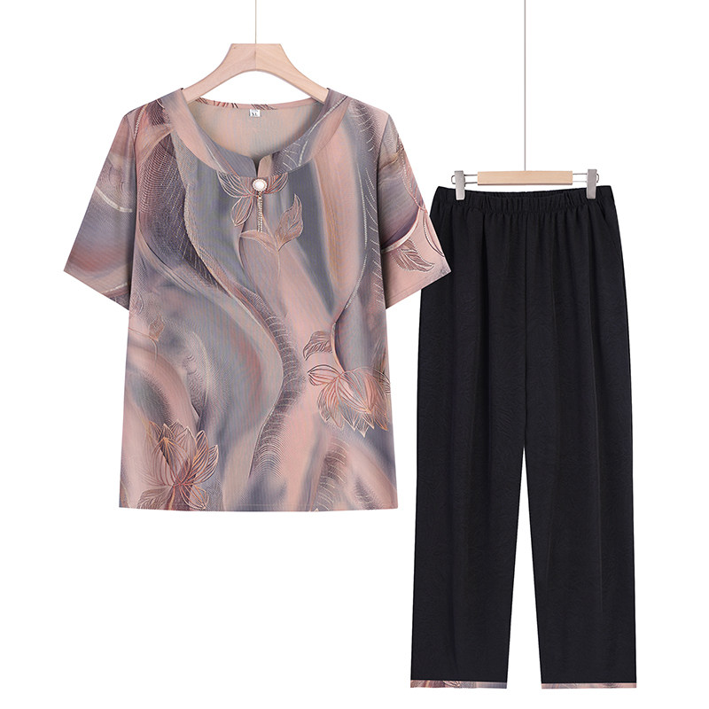 妈妈夏季宽松圆领七分袖上衣中老年人国风女装两件套薄款奶奶套装