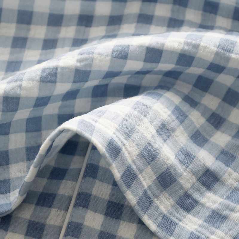 简约格子无印风睡衣男春夏季纯棉纱布双层薄款短袖长裤家居服套装