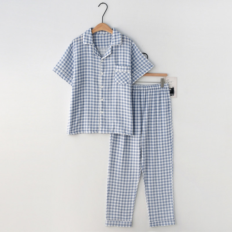 男纯棉纱布格子简约短袖长裤睡衣