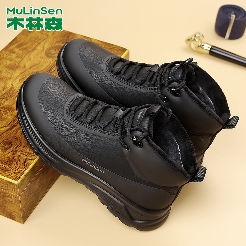木林森男鞋2025冬季皮毛一体加厚保暖棉鞋中年男士休闲皮鞋雪地靴