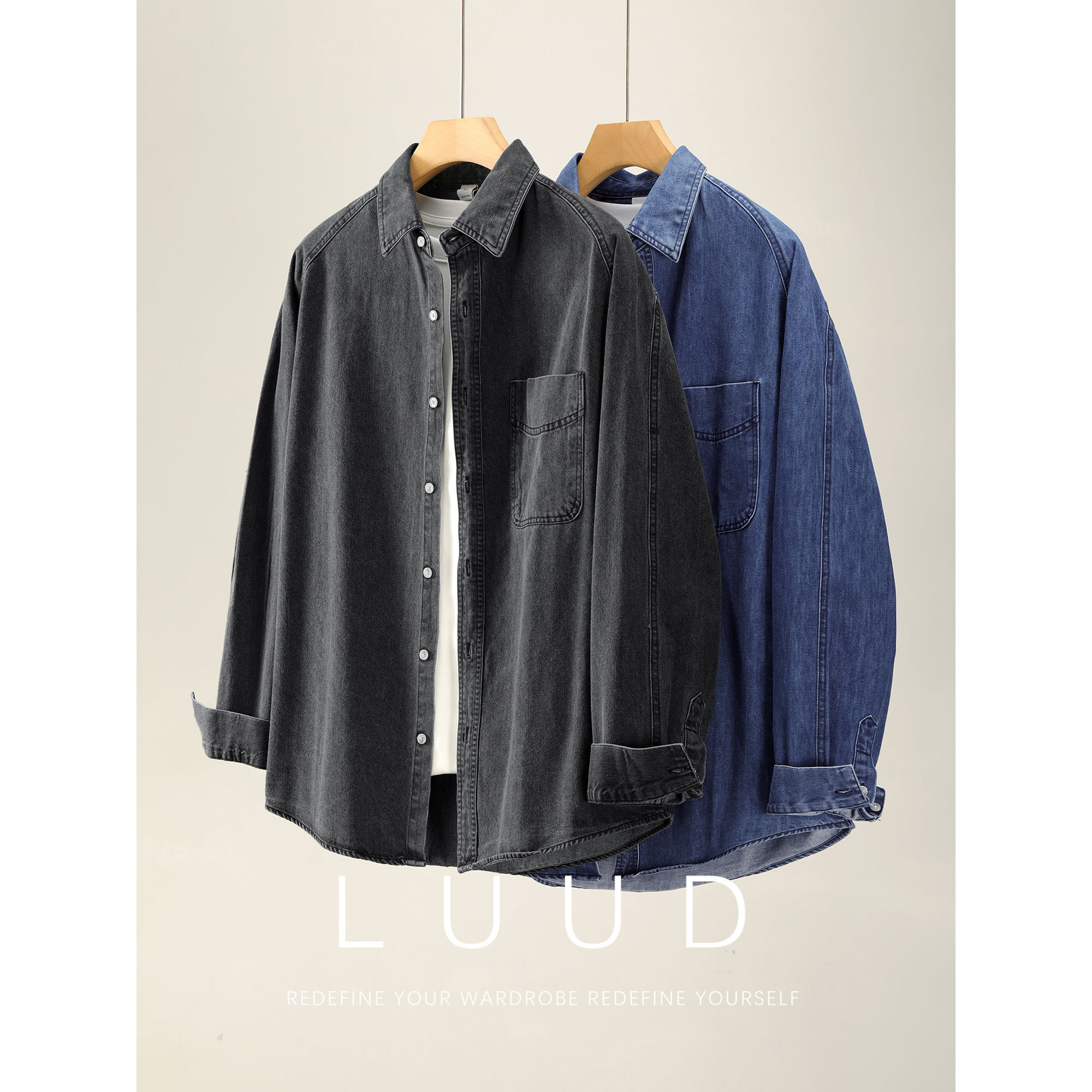 LUUD 水洗做旧男士辑明线口袋工装衬衣外套重磅280g牛仔长袖衬衫