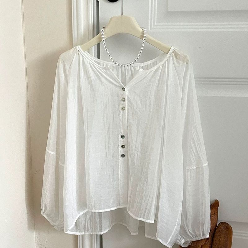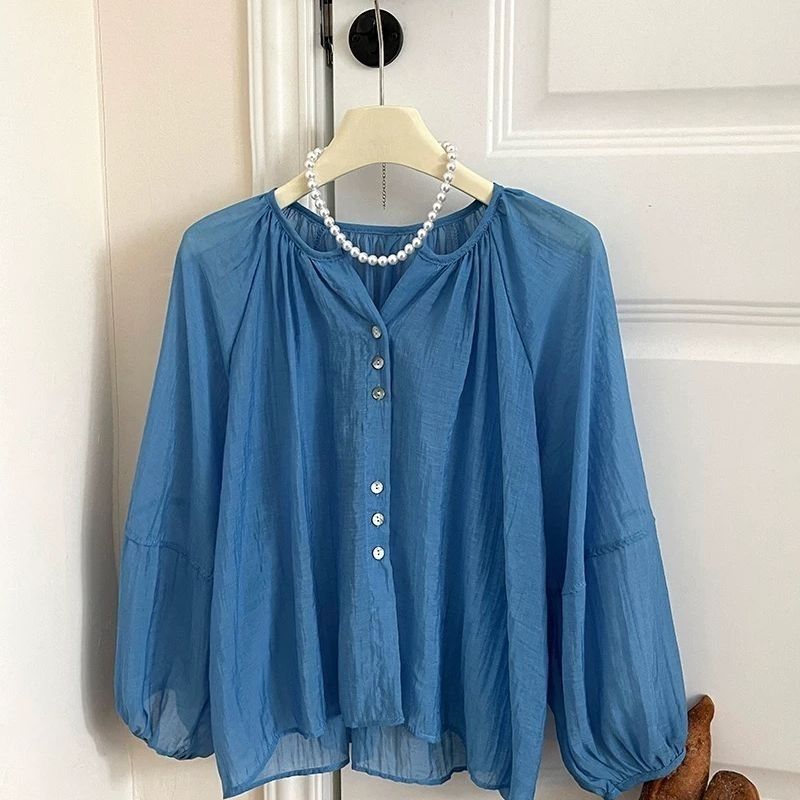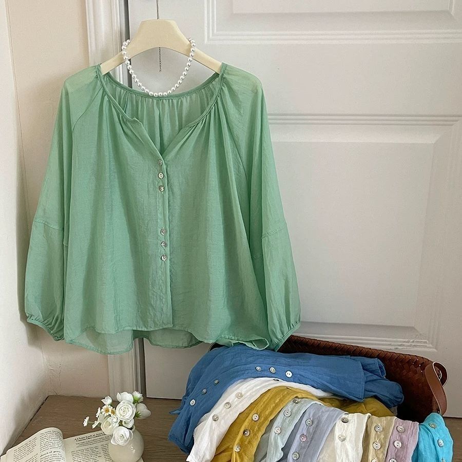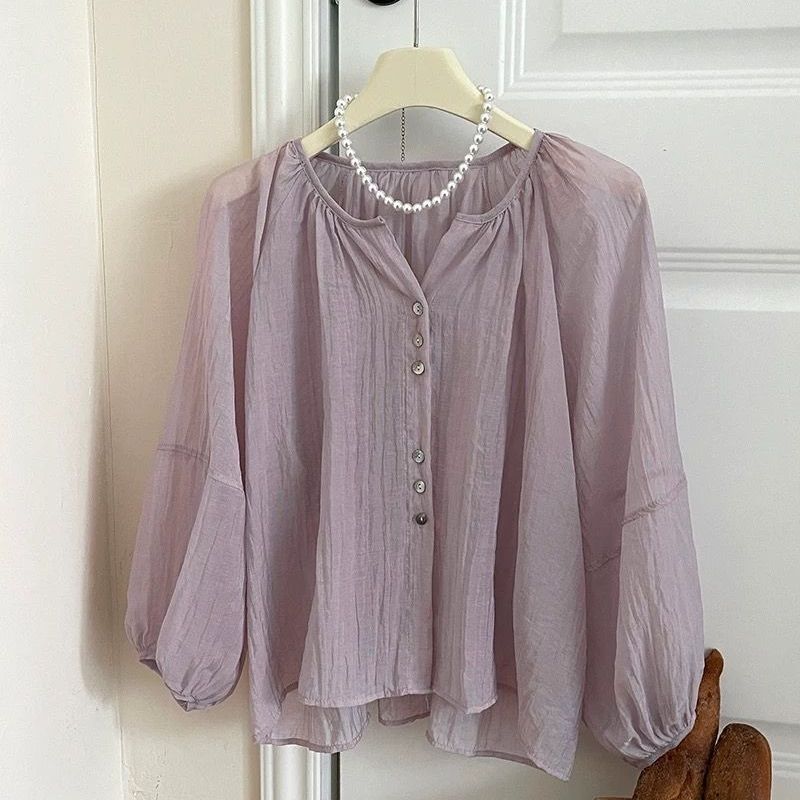 法式复古度假风冰丝麻棉防晒衬衫女夏灯笼袖外搭空调娃娃罩衫上衣