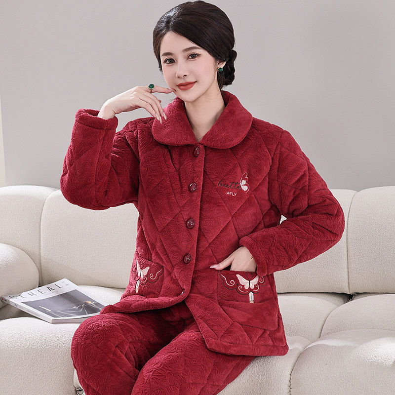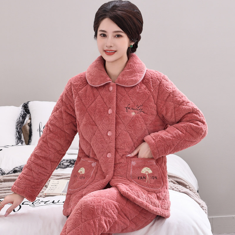 睡衣女士秋冬季三层加厚加绒夹棉袄中老年妈妈款珊瑚绒家居服套装
