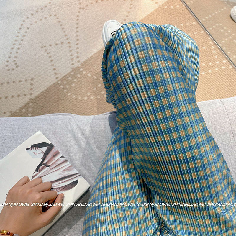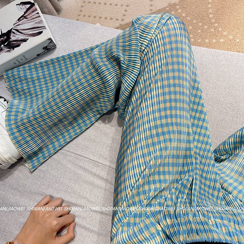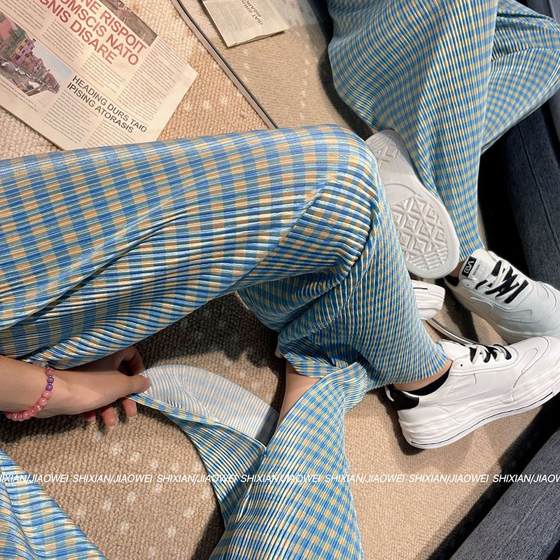 小清新2022年夏季新款格子阔腿裤女学生百搭松紧高腰宽松休闲长裤