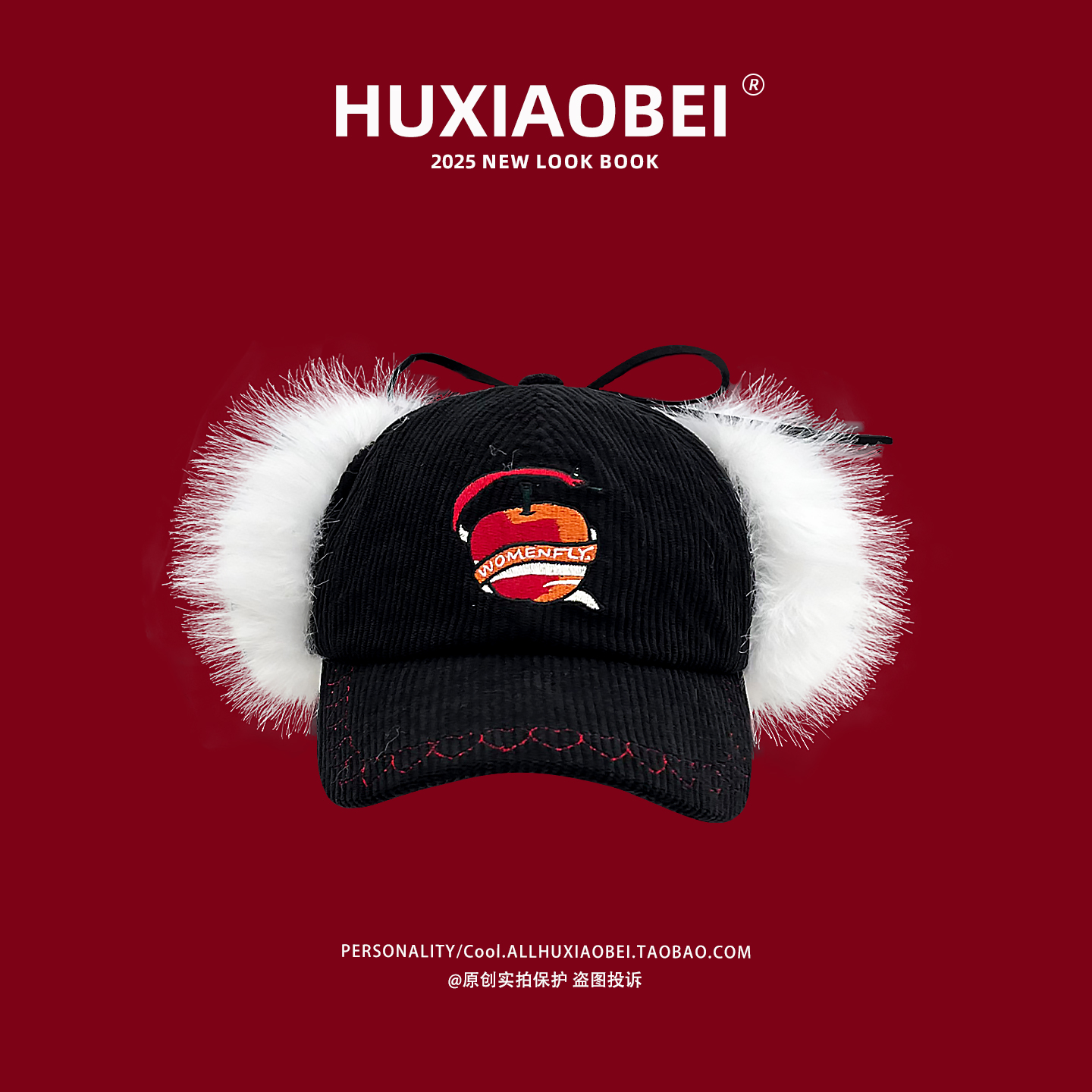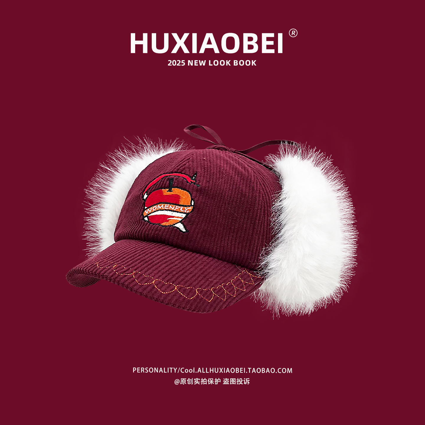 复古苹果刺绣毛茸茸护耳雷锋帽女冬季保暖时髦辣妹灯芯绒鸭舌帽子