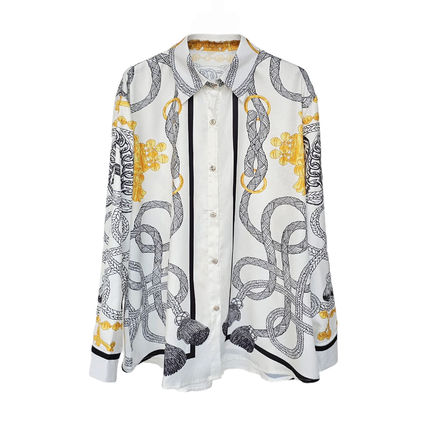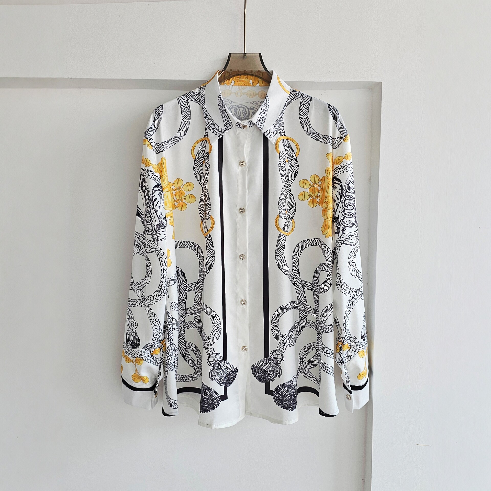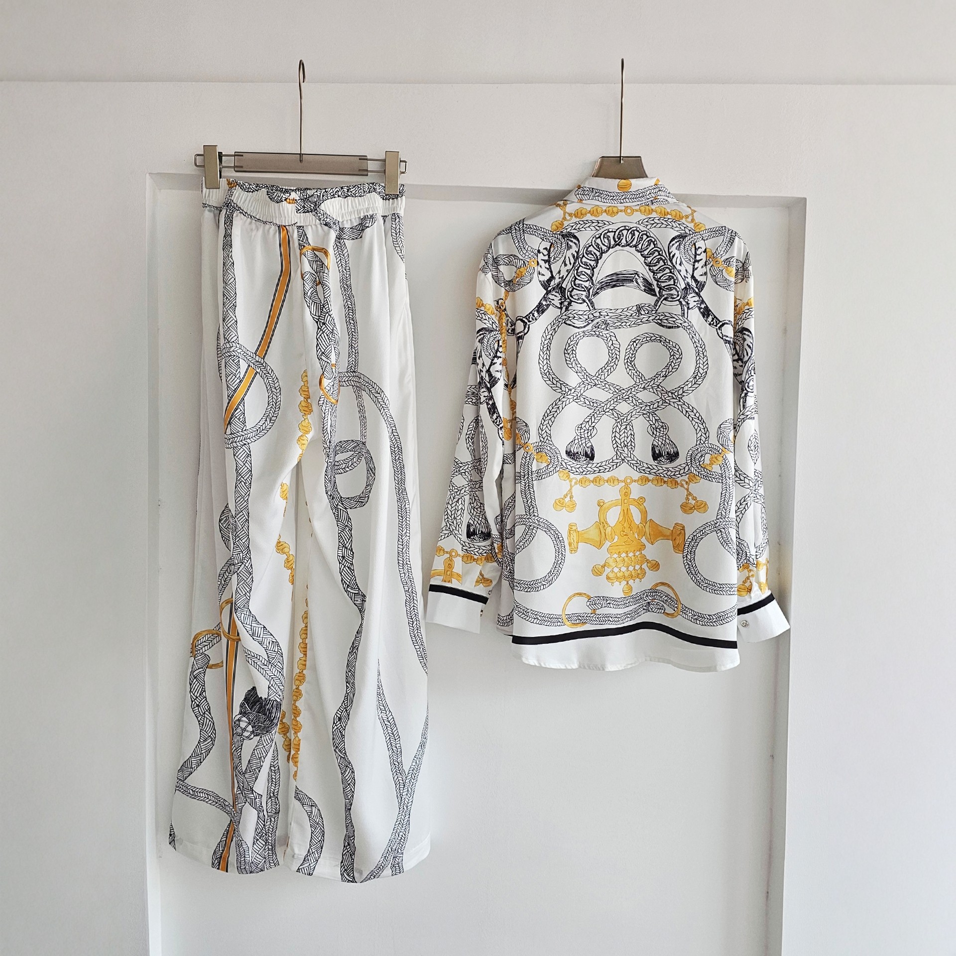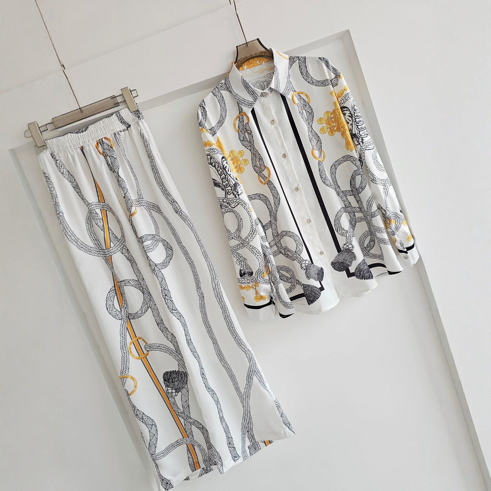 明星款两件法式老钱风H家绳结印染长袖衬衫阔腿裤秋气质时尚套装