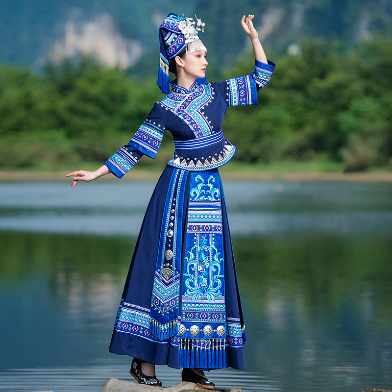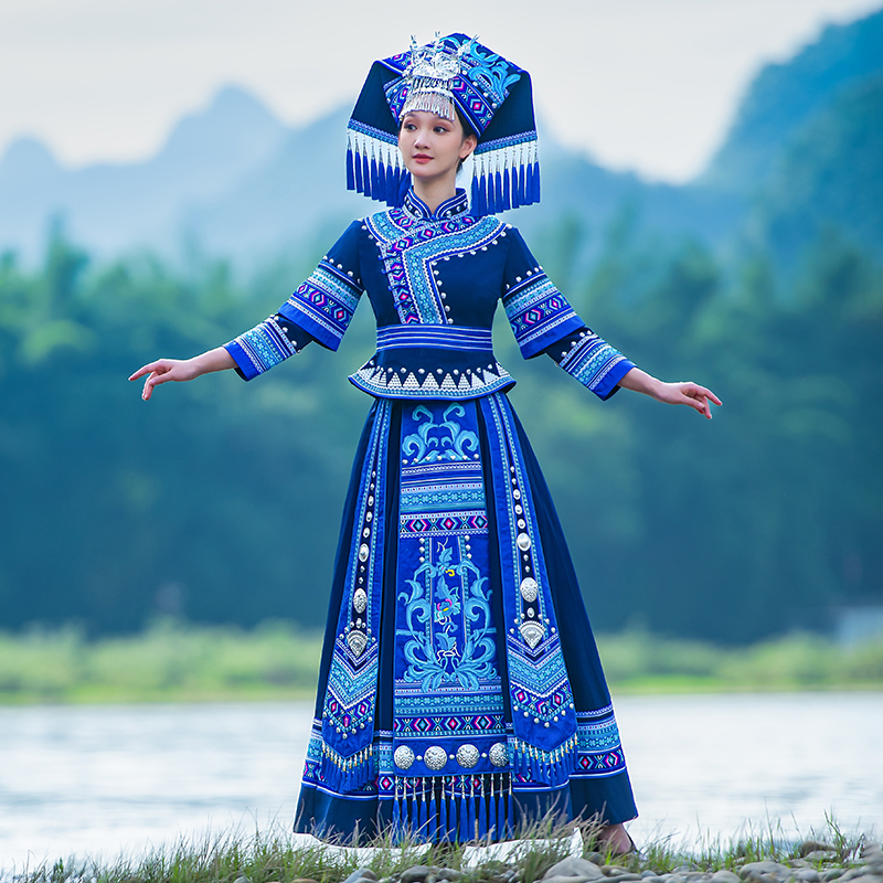 广西三月三服装女壮族服饰少数民族新款长裙绿色套装舞蹈演出服