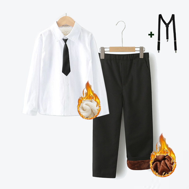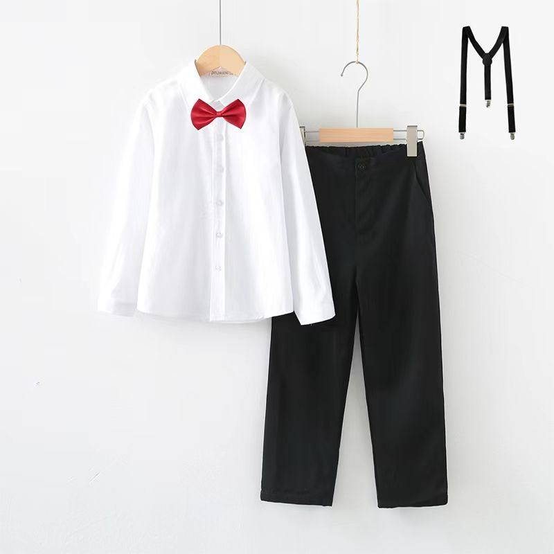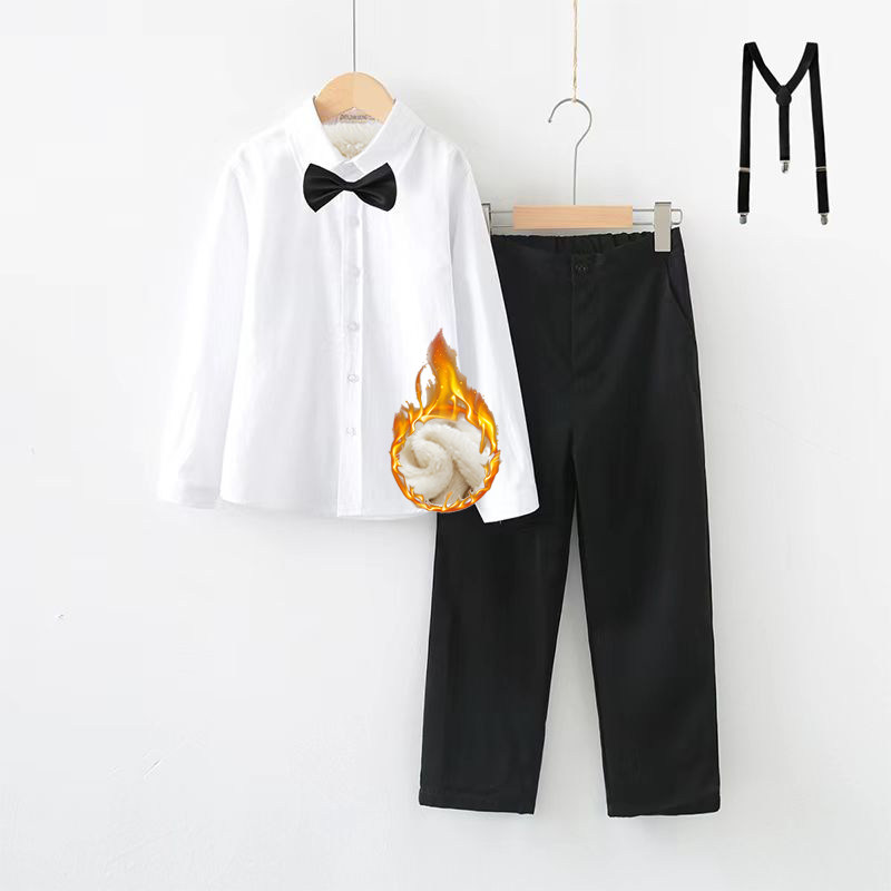 男童演出服加绒白衬衫套装男孩小花童背带裤幼儿园主持人合唱班服