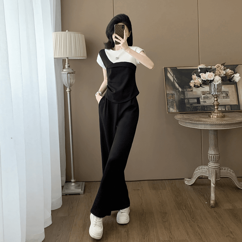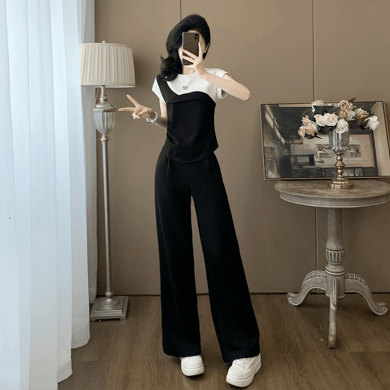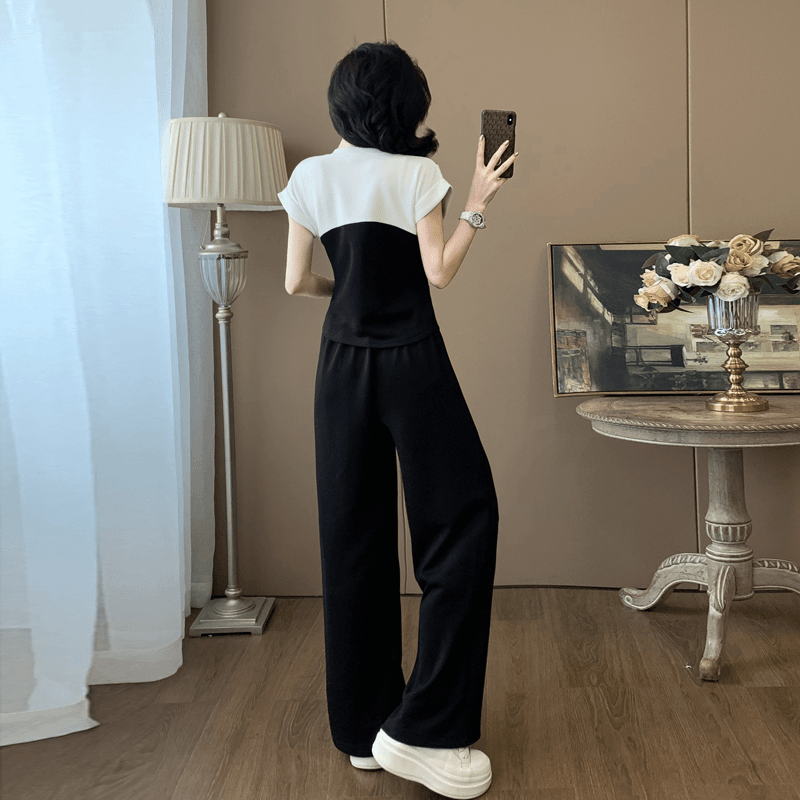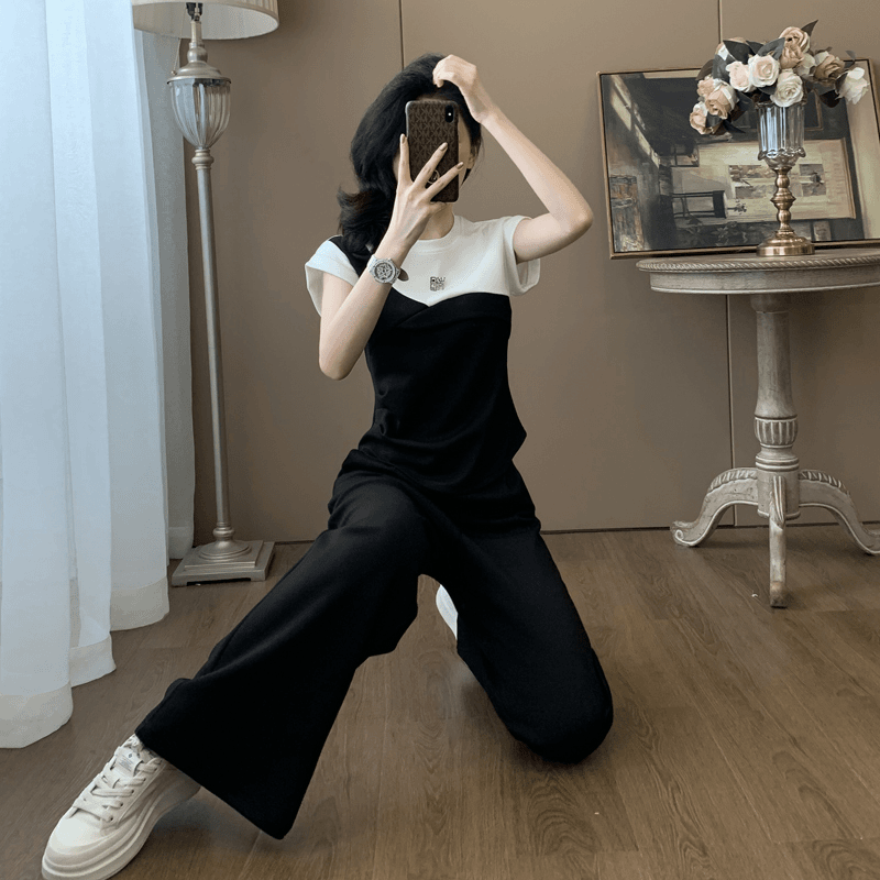 休闲运动套装女夏季2025新款显瘦高级感撞色拼接短袖阔腿裤两件套