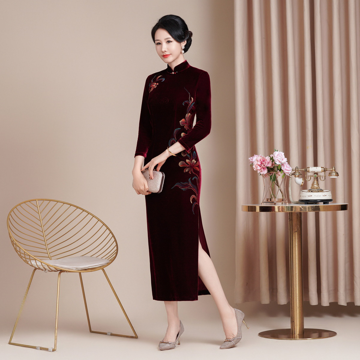 秋冬新款修身丝绒旗袍高级感喜婆婆喜妈妈装敬酒服长款礼服女