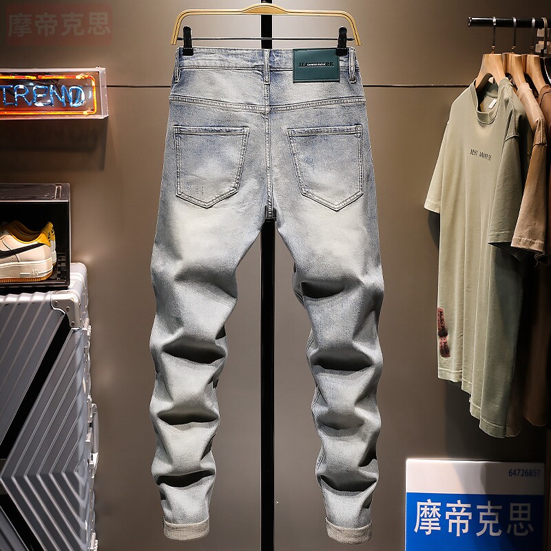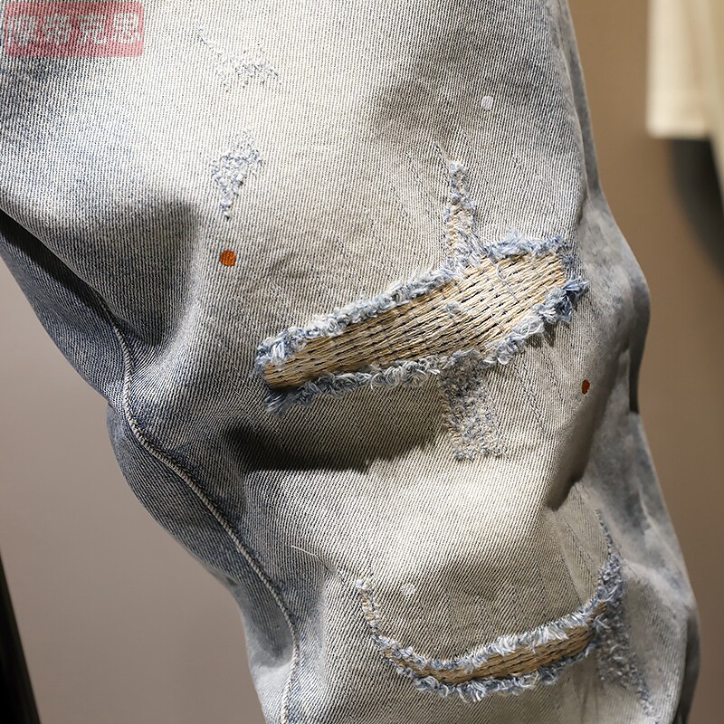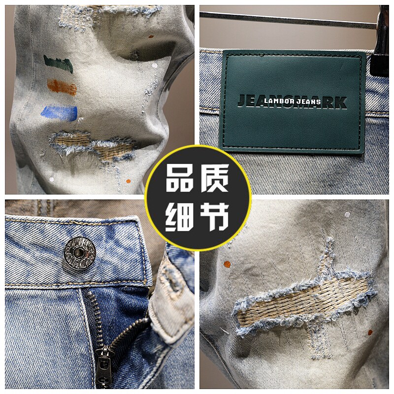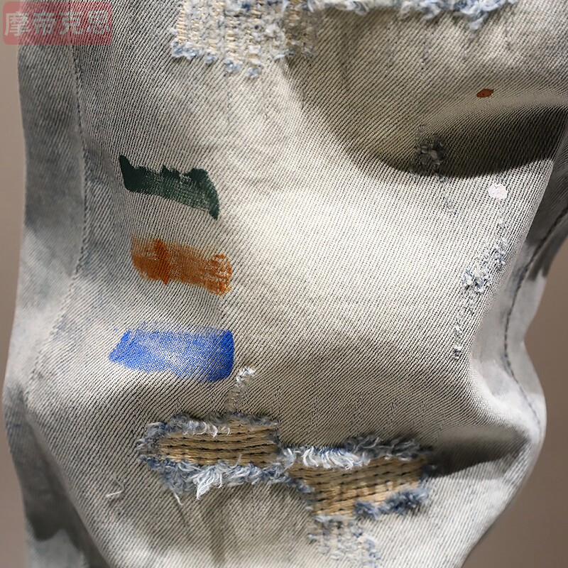 潮牌破洞九分牛仔裤男油漆9分裤