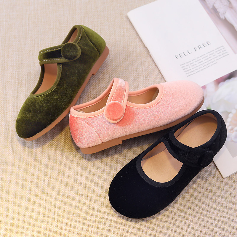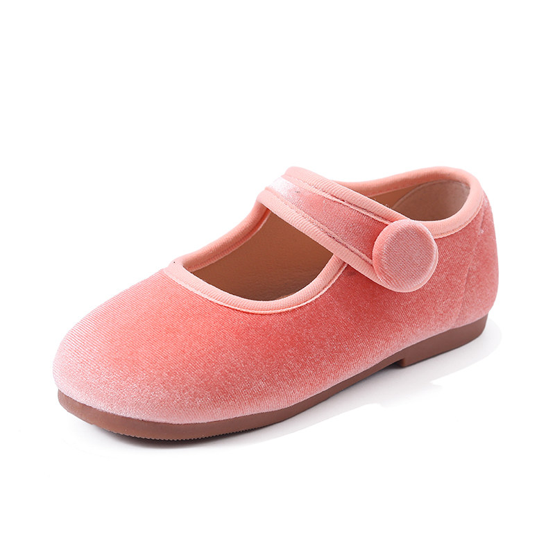 儿童复古单鞋粉色丝绒鞋子女童鞋百搭皮鞋女宝宝公主鞋软底豆豆鞋