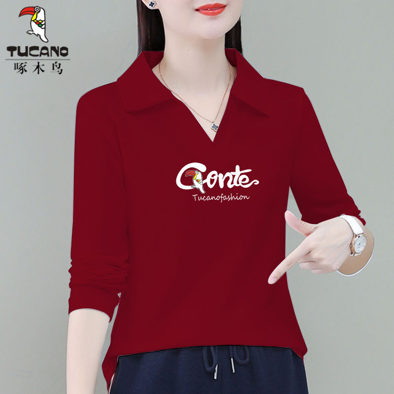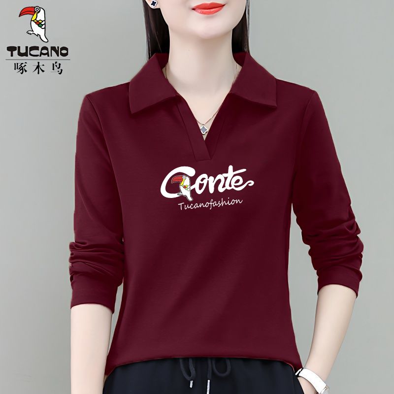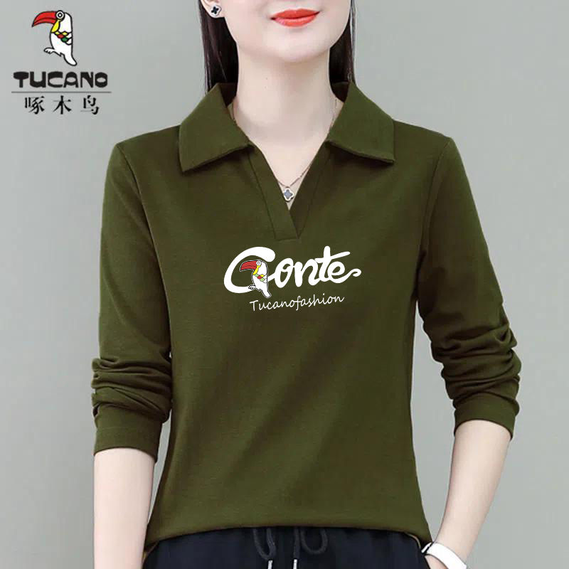 啄木鸟长袖T恤女纯棉ins潮春秋2024年时尚百搭翻领修身套头打底衫