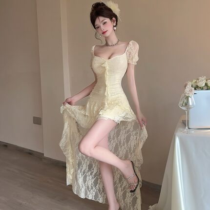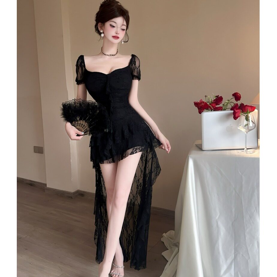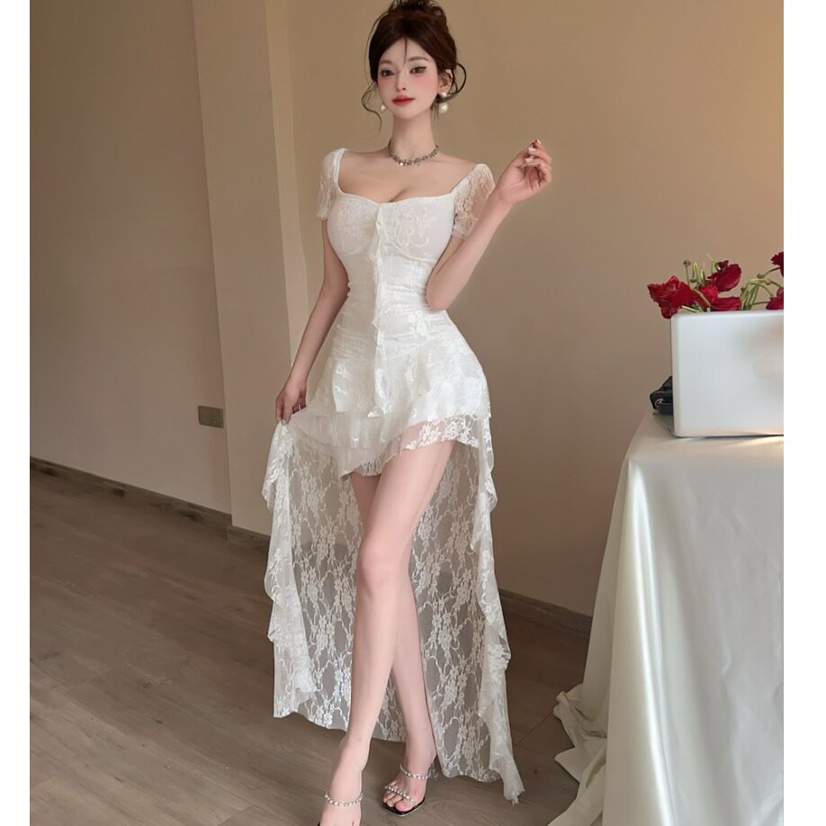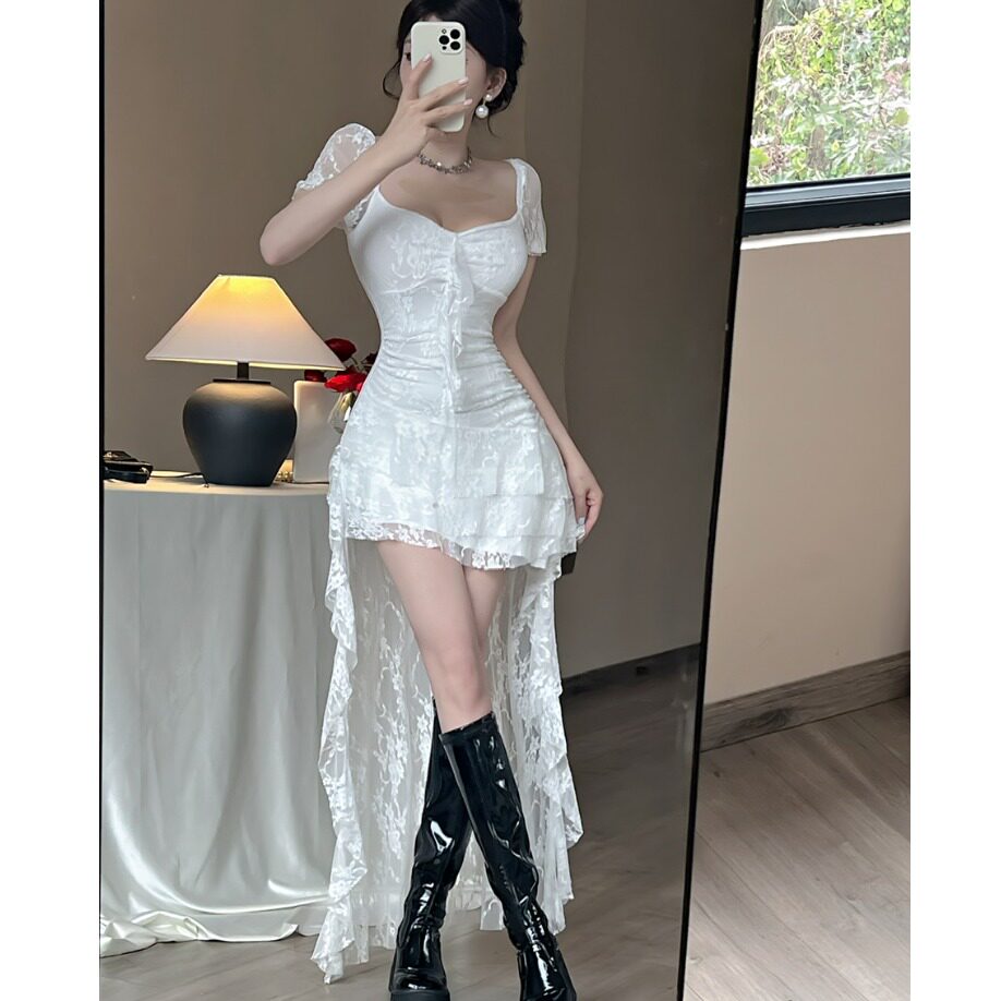 2026夏季新款性感纯欲风前短后长不规则在逃公主蕾丝短袖连衣裙女