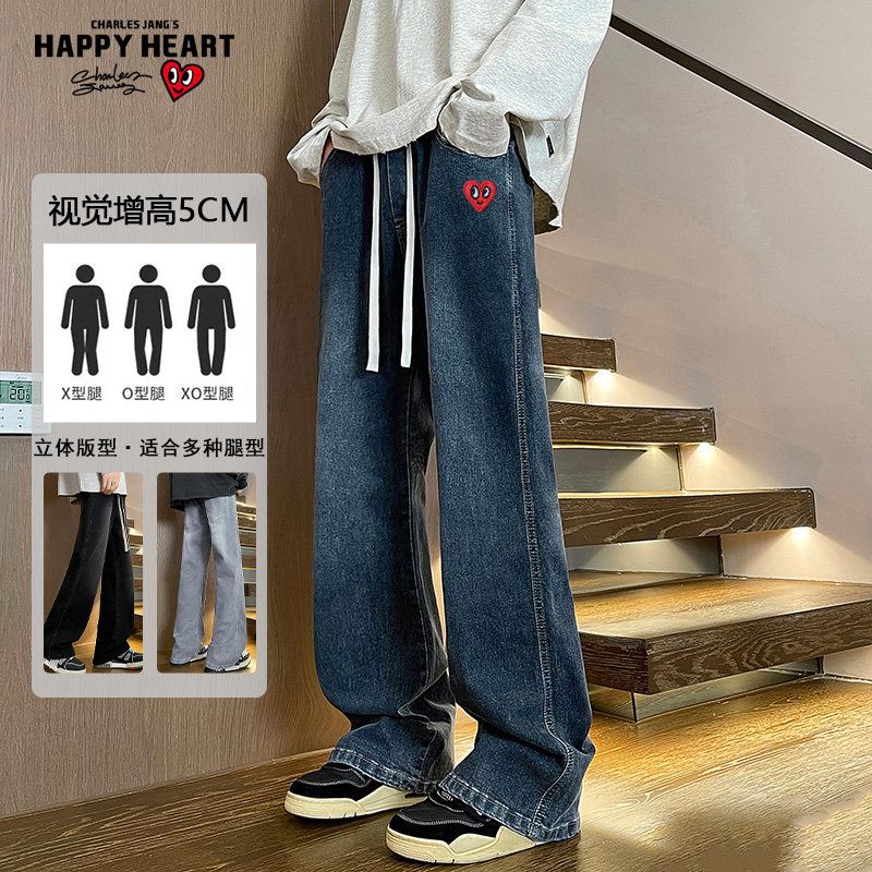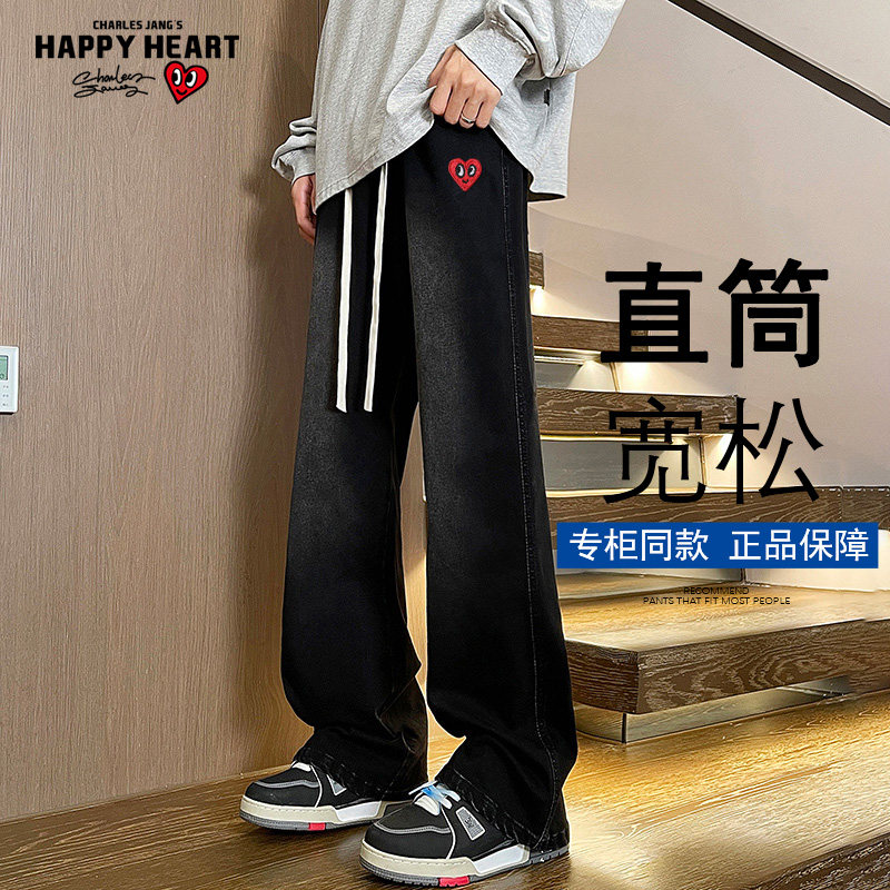 查尔斯桃心美式水洗牛仔裤男款复古抽绳微喇弯刀直筒垂感休闲长裤