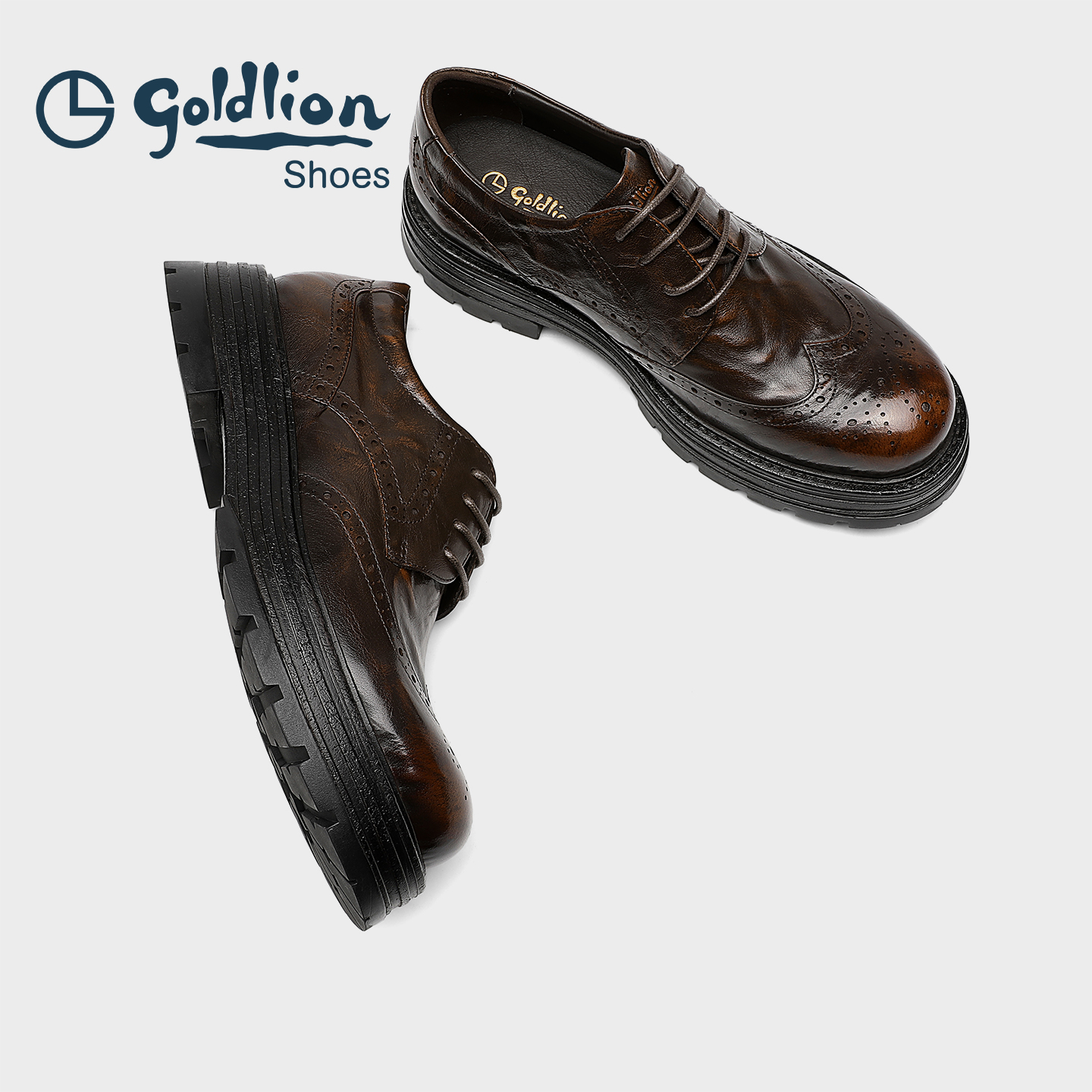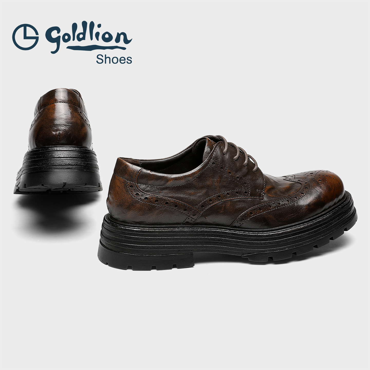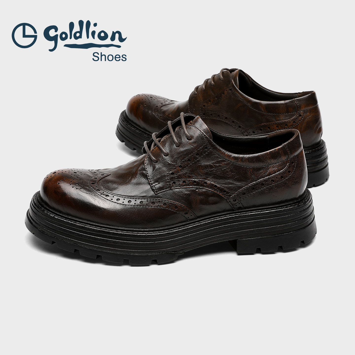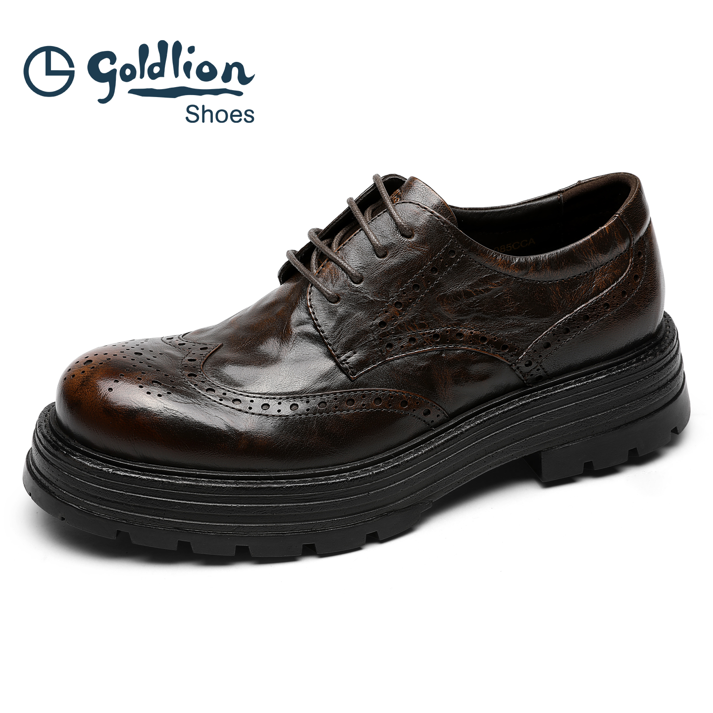 Goldlion皮鞋官方正品2025秋季新款布洛克鞋男士厚底商务正装皮鞋