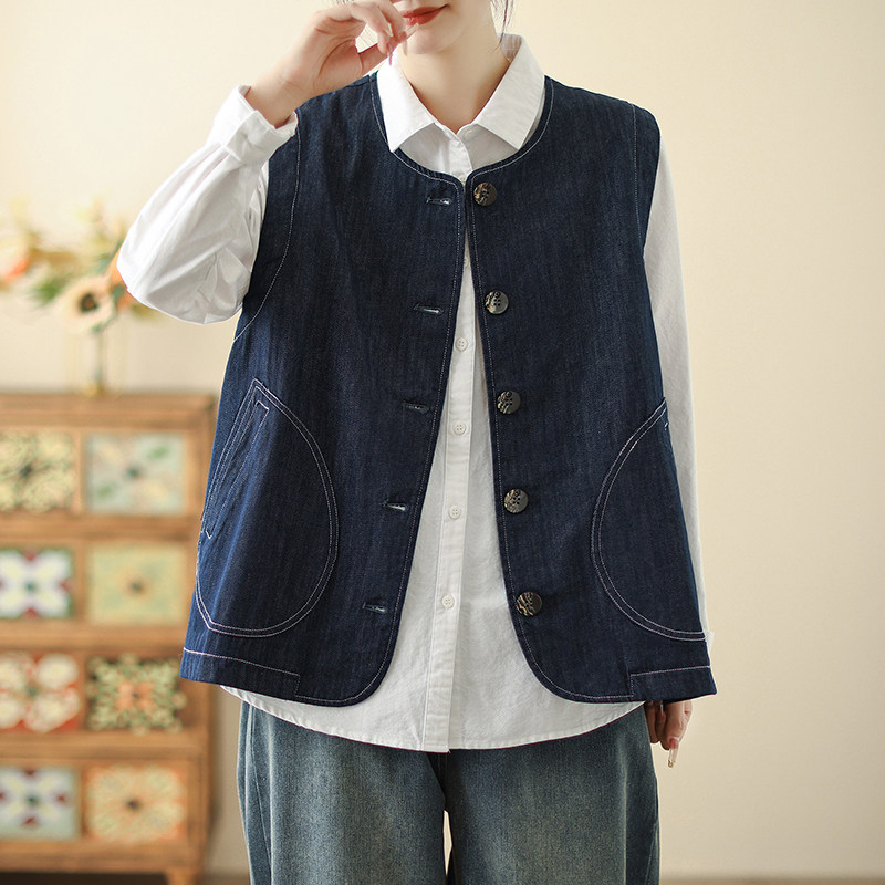 文艺复古牛仔马甲背心女春秋新款气质圆领马夹叠穿无袖上衣外套潮