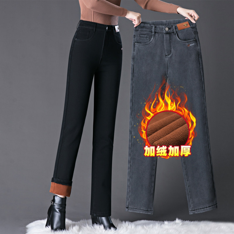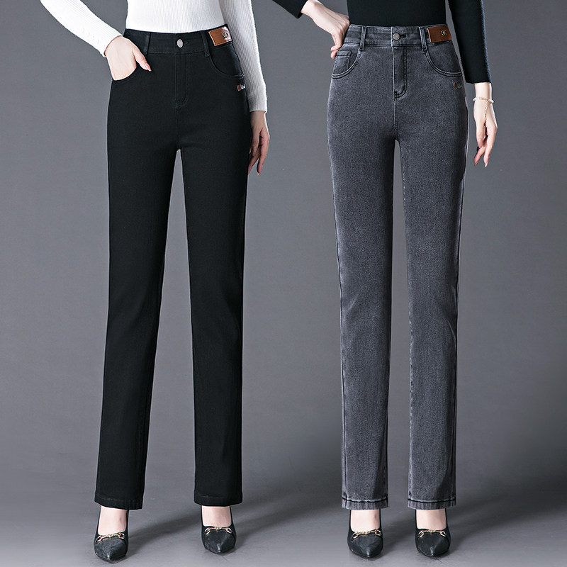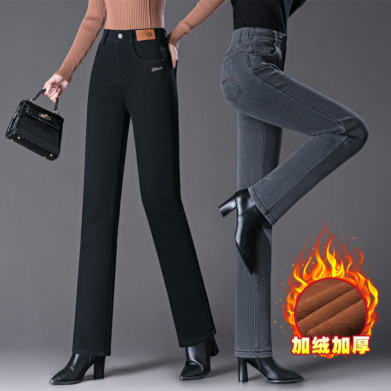 逸阳女裤2025秋冬装新款品牌牛仔裤烟灰色妈妈弹力加绒直筒长裤子