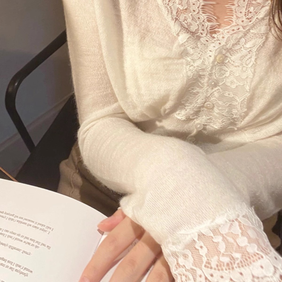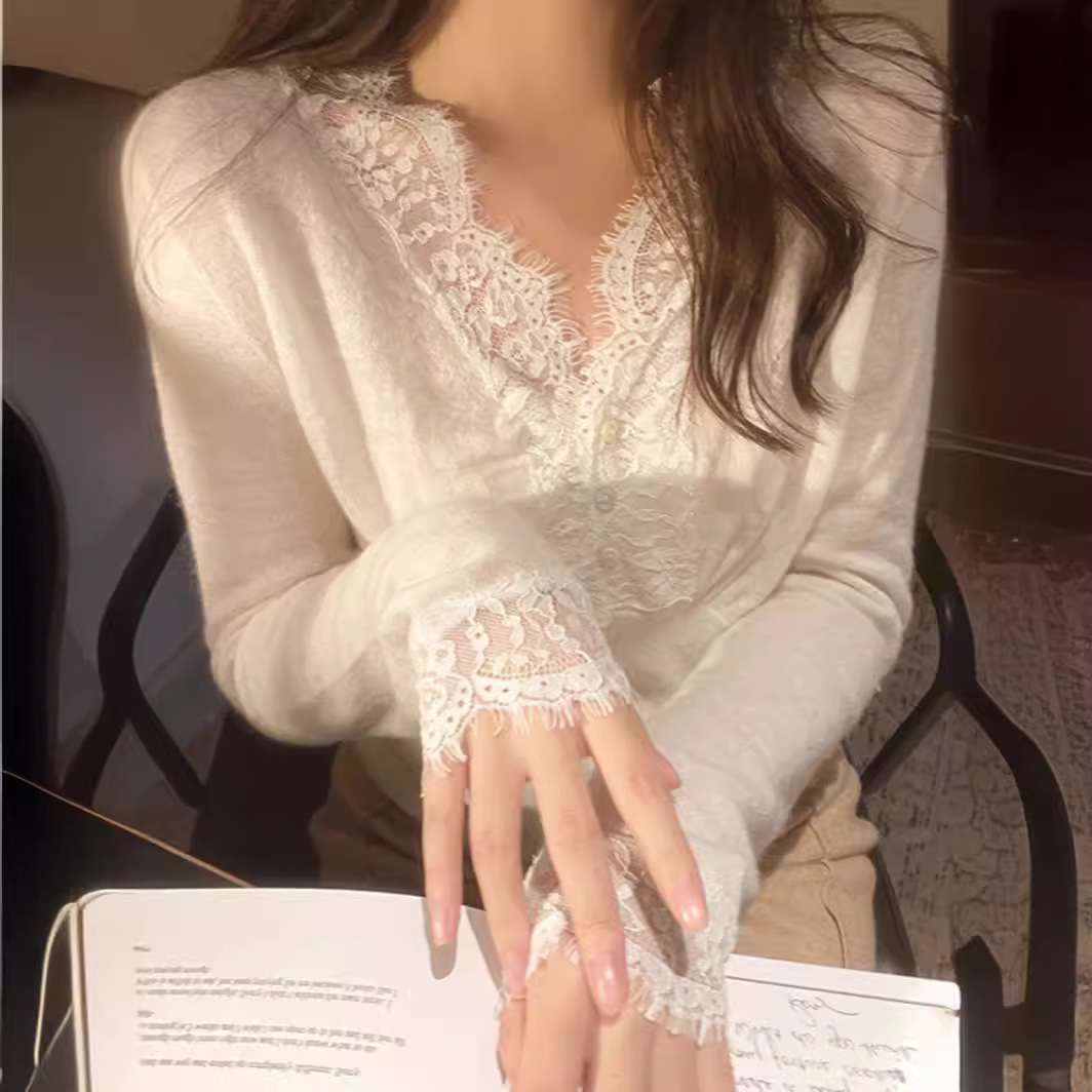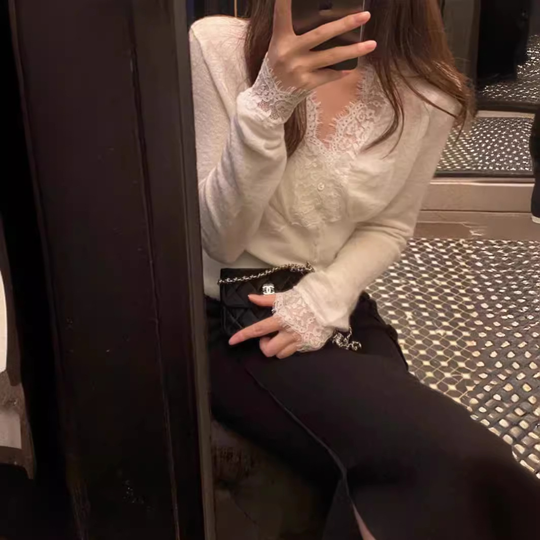 白色v领蕾丝花边针织衫女秋季高级感内搭别致独特绝美毛衣打底衫