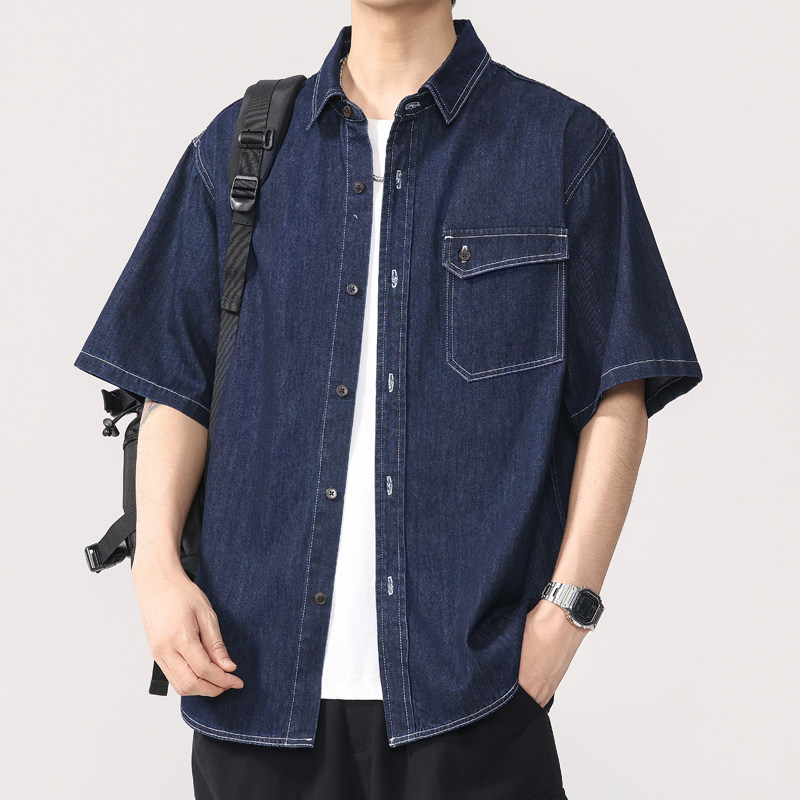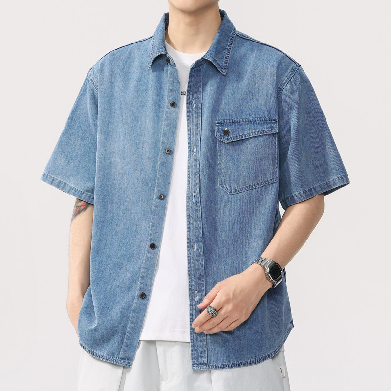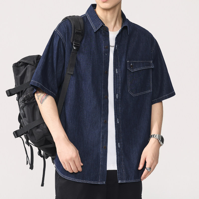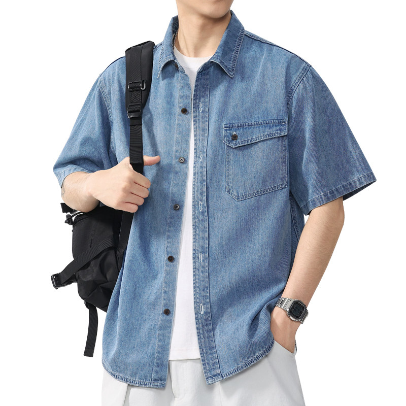罗蒙男士短袖衬衫夏季薄款宽松凉感2025新款潮牌休闲牛仔衬衣男款
