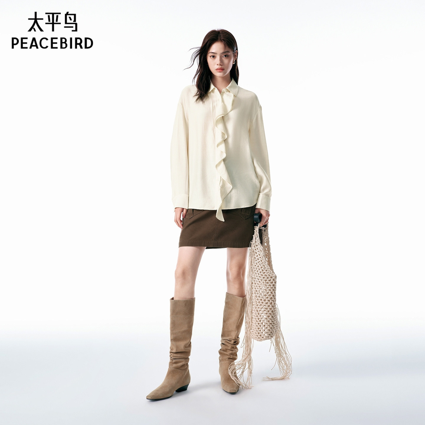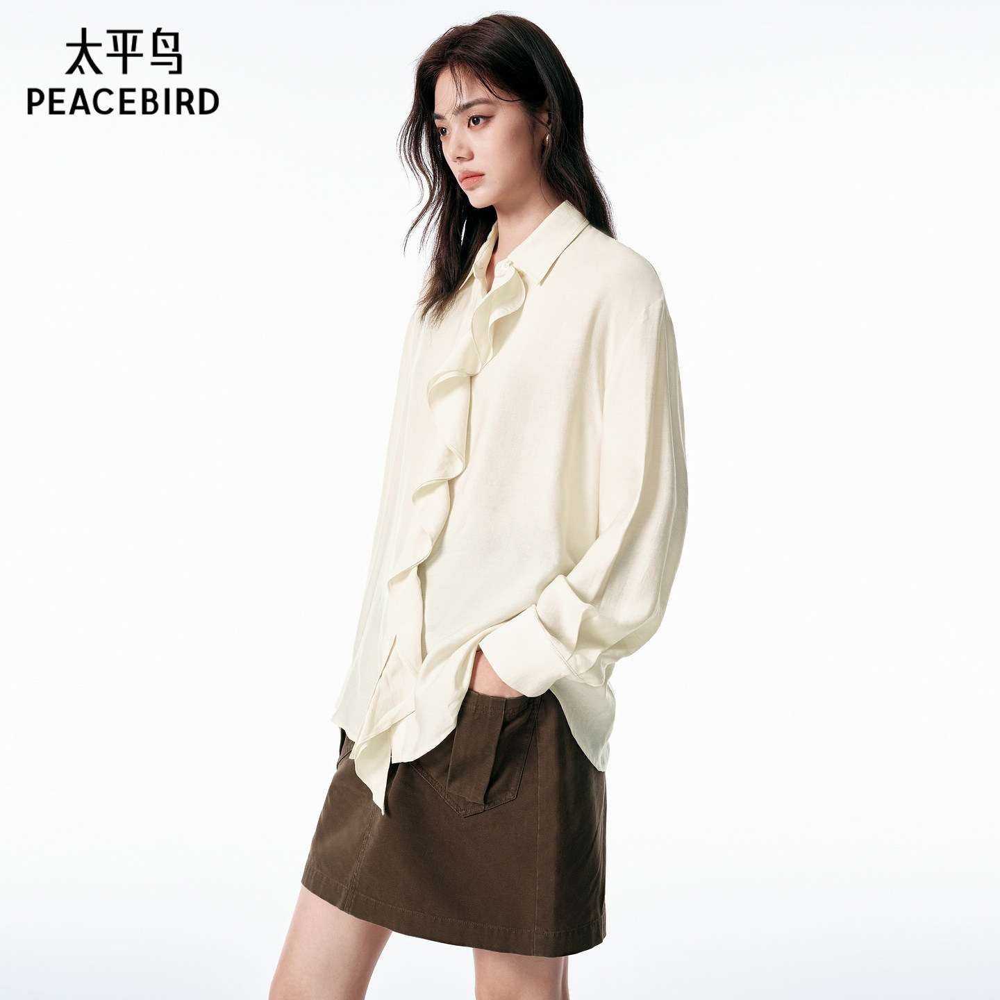 太平鸟 羊毛混纺可拆卸荷叶边长袖衬衫26春季新款法式宽松衬衣女