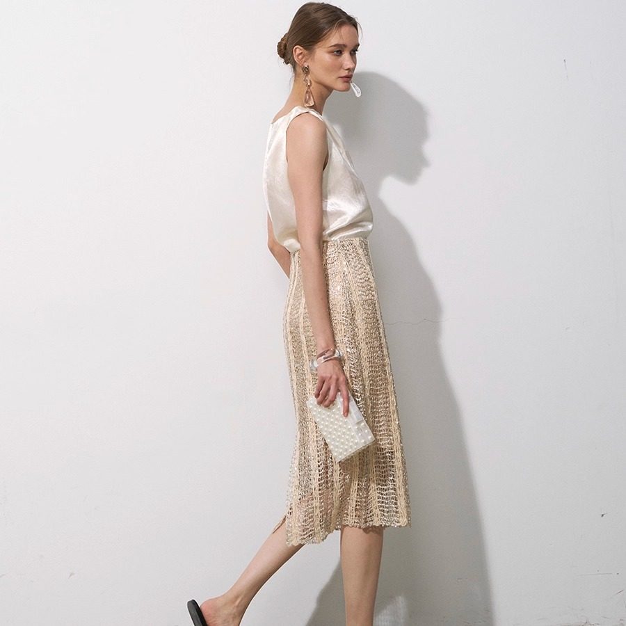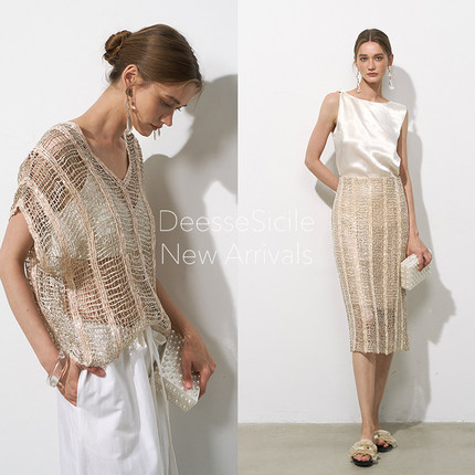 DeesseSicile夏季呼吸感亚麻真丝亮片网眼编织蝙蝠上衣半裙套装女