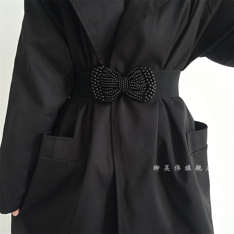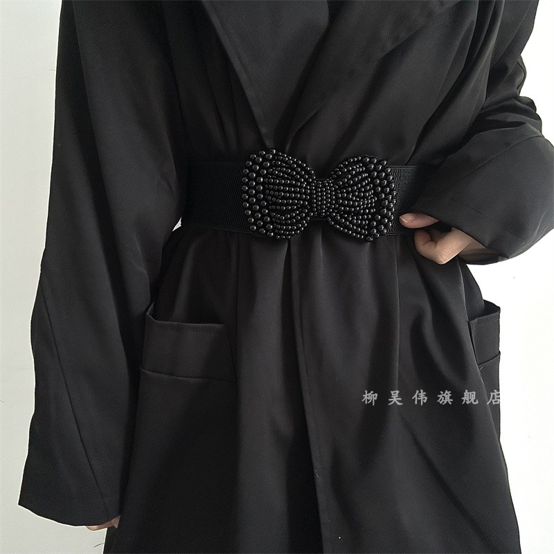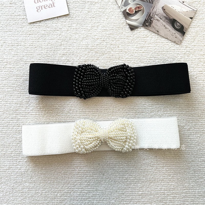 2025新款韩版女士松紧腰带珍珠蝴蝶结弹力腰封百搭装饰配连衣裙子