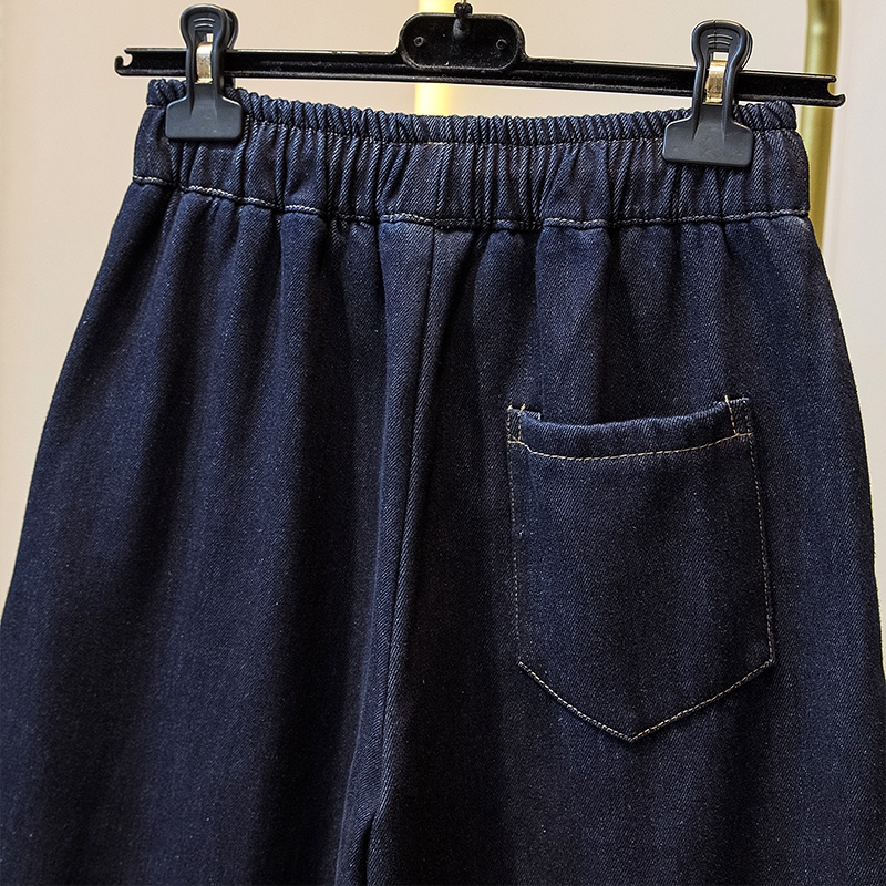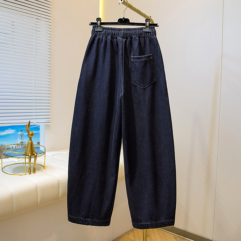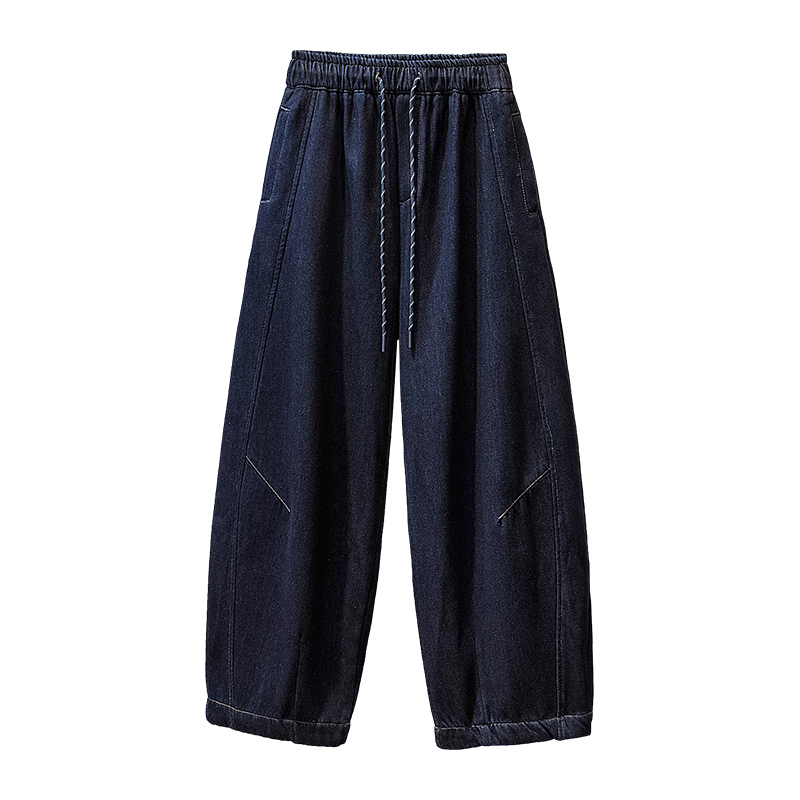简约通勤松紧腰显瘦系带牛仔哈伦裤女秋季款宽松百搭拼接阔腿裤潮