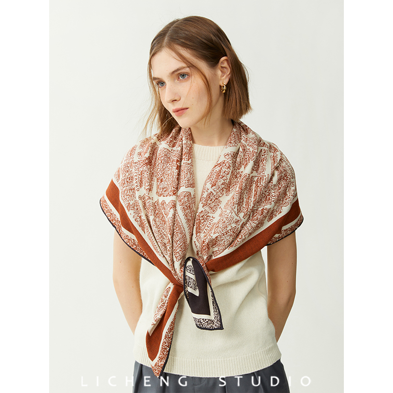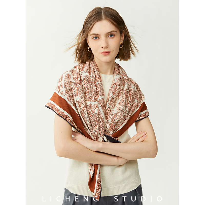 礼诚 巴黎地图 双面异色真丝羊毛围巾冬季女轻奢丝毛方巾两用披肩