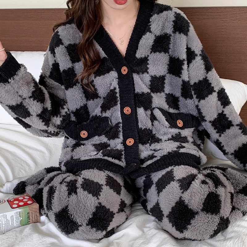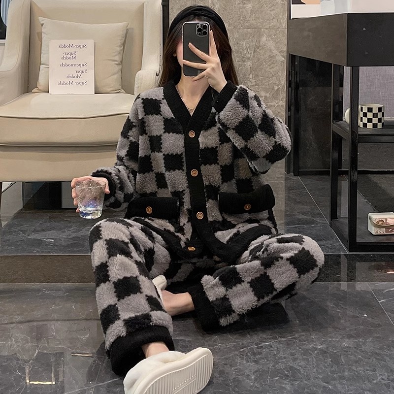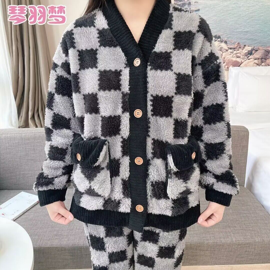 睡衣女款秋冬季珊瑚绒大码法兰绒加厚格子春小香风春秋套装家居服