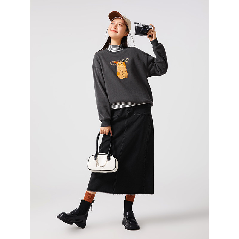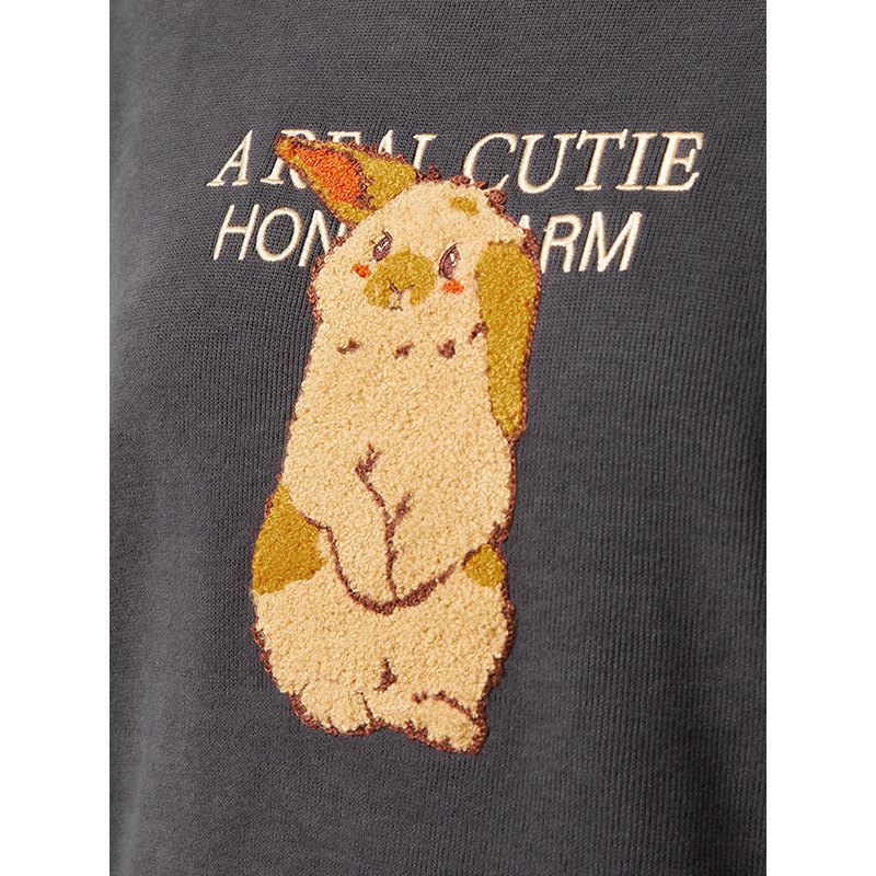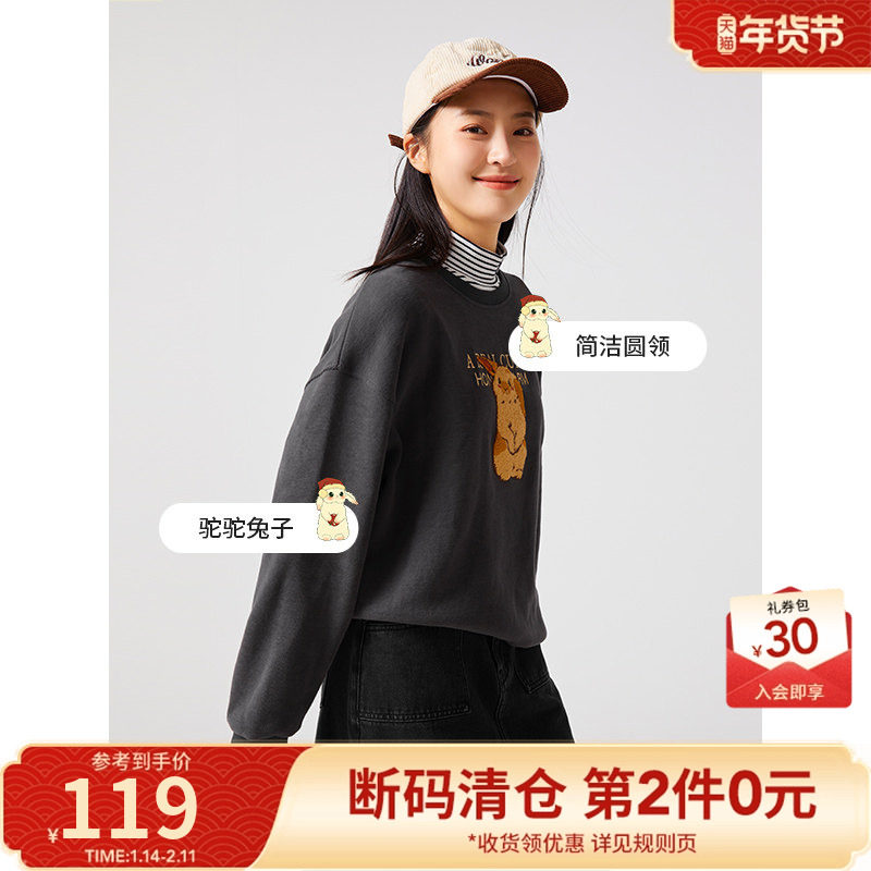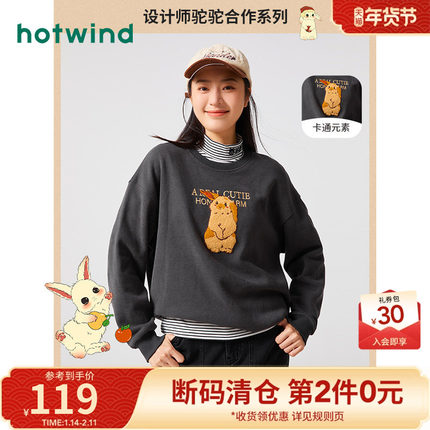 热风2023冬季新款女士兔子图案卡通圆领卫衣加绒保暖宽松百搭上衣