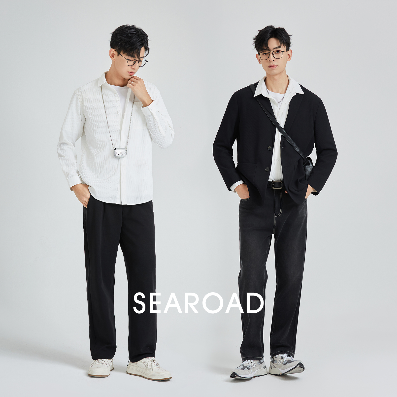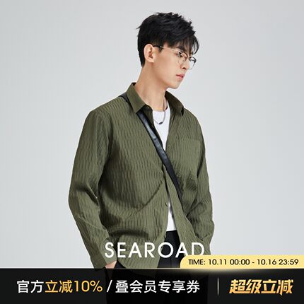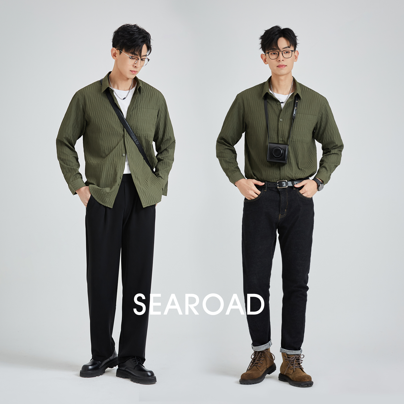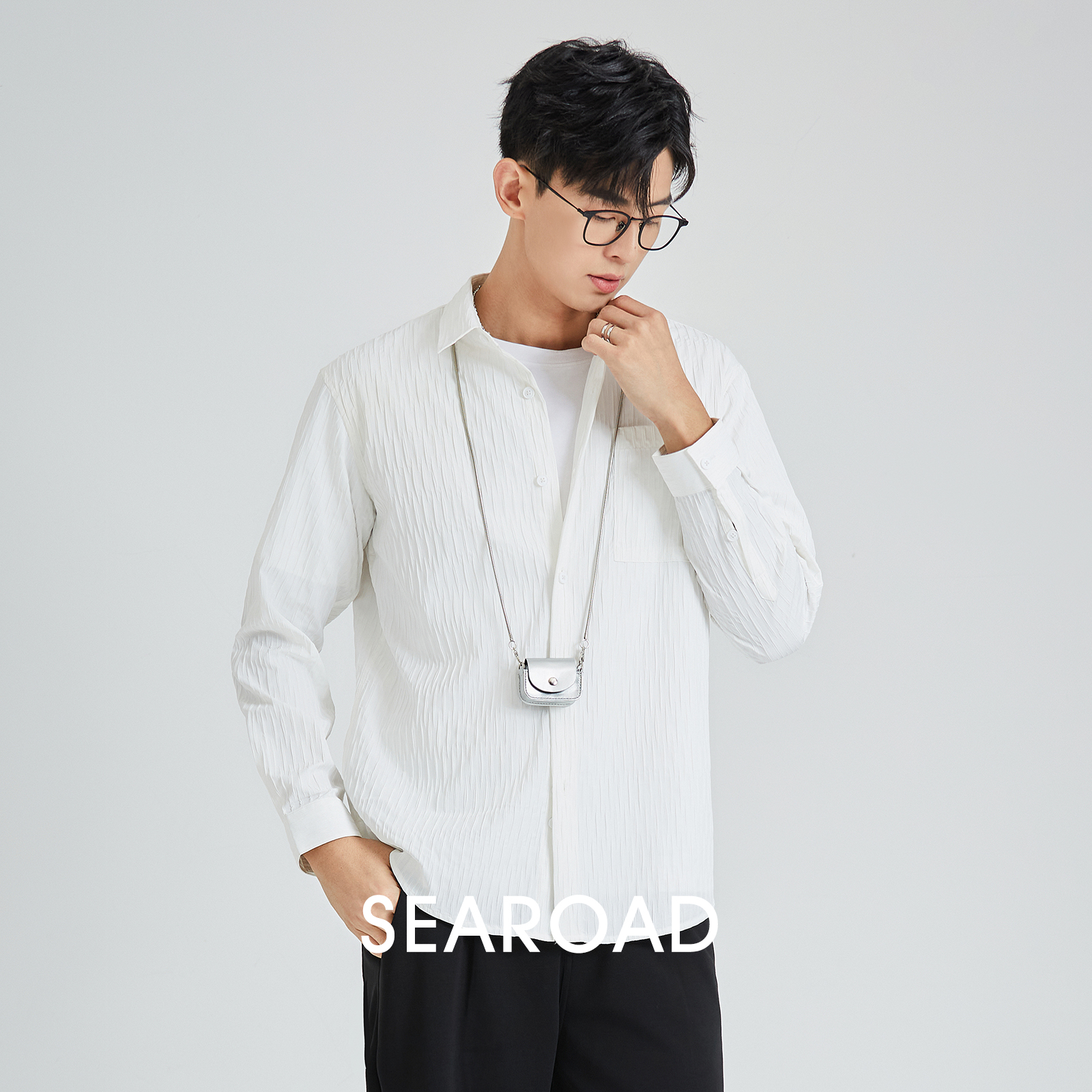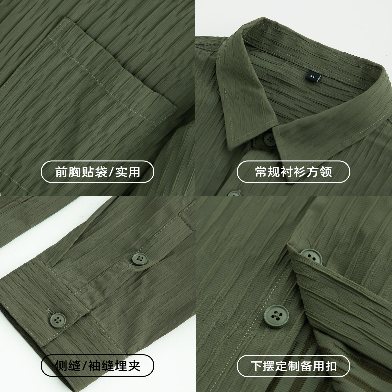 海上公路韩版高级感叶皱肌理感翻领长袖衬衫男士春季通勤百搭衬衣