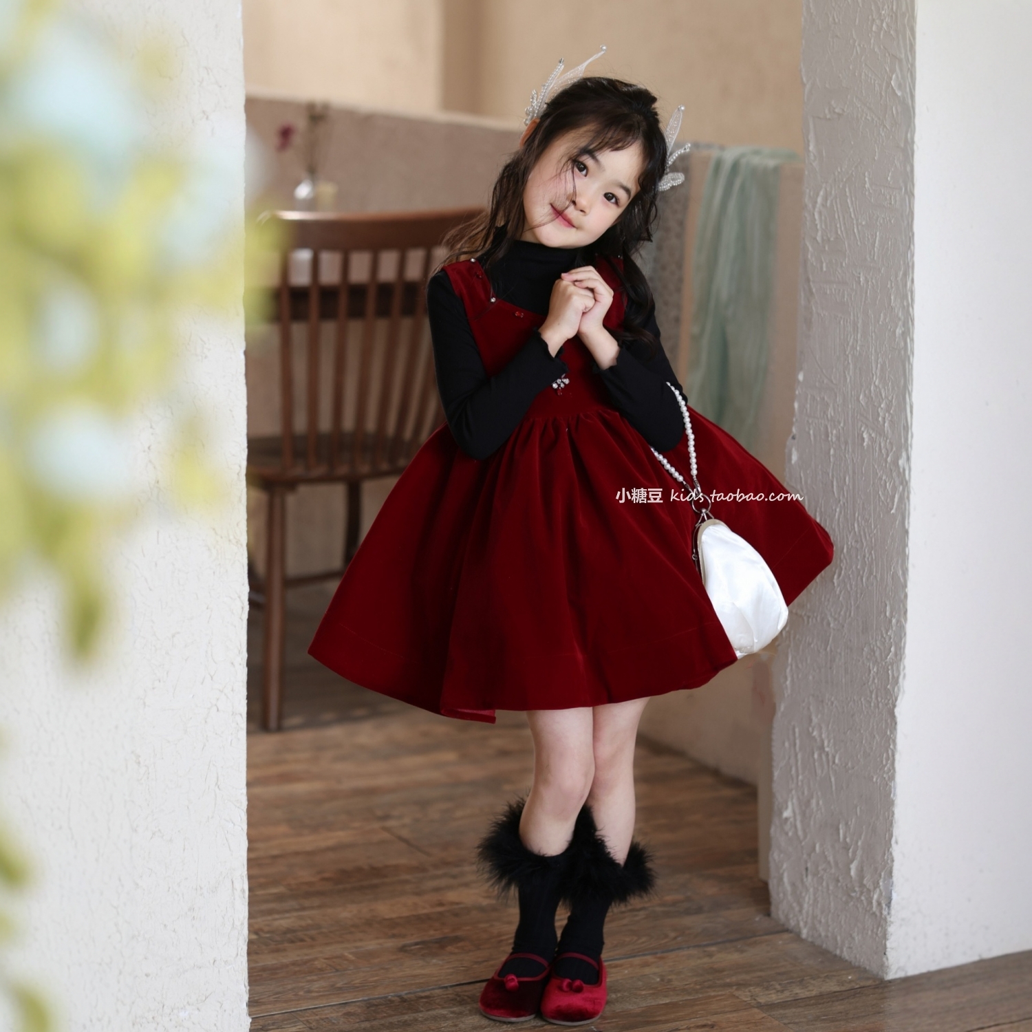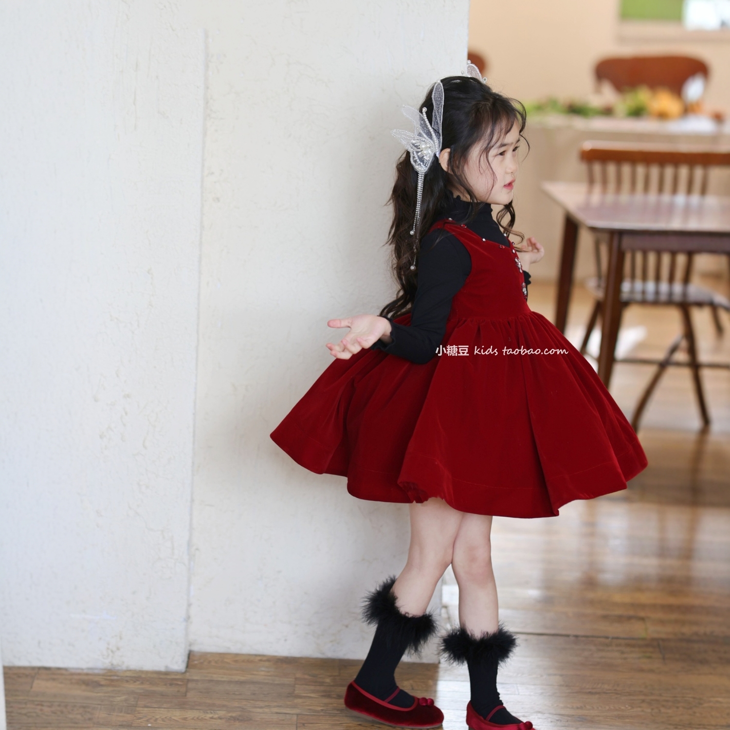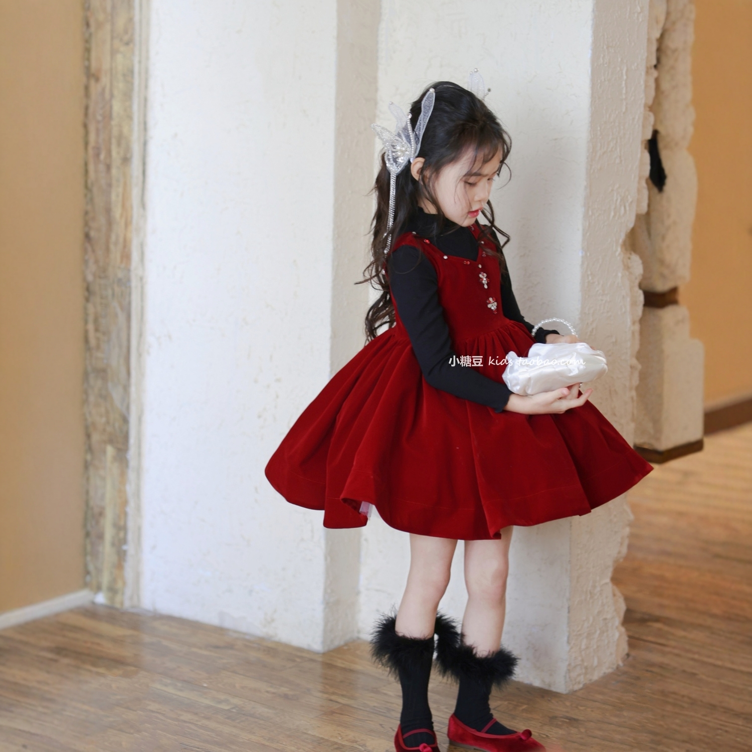女童手工订钻红色丝绒背心裙公主裙2025冬女孩加绒生日表演连衣裙