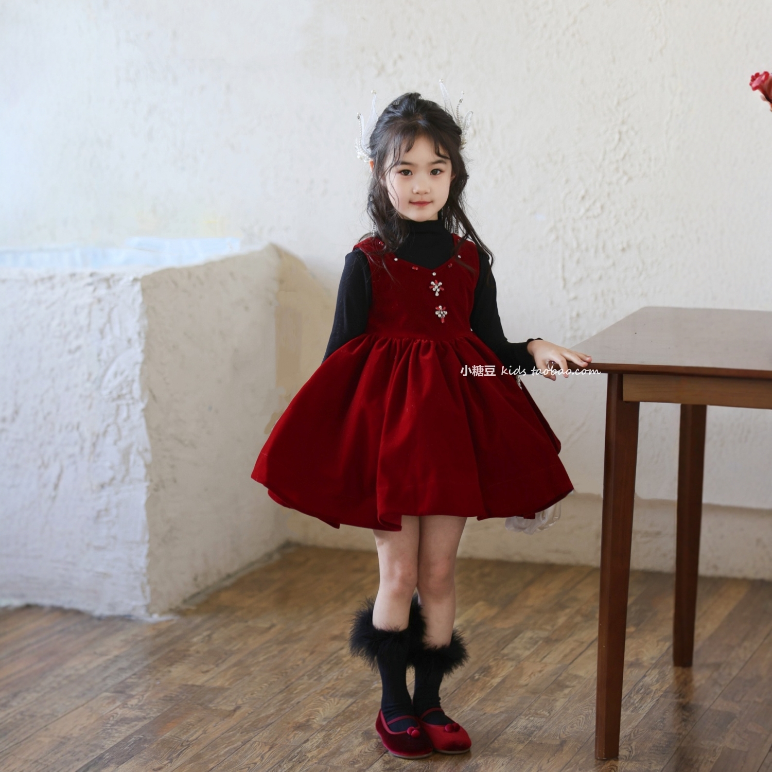 女童手工订钻红色丝绒背心裙礼服