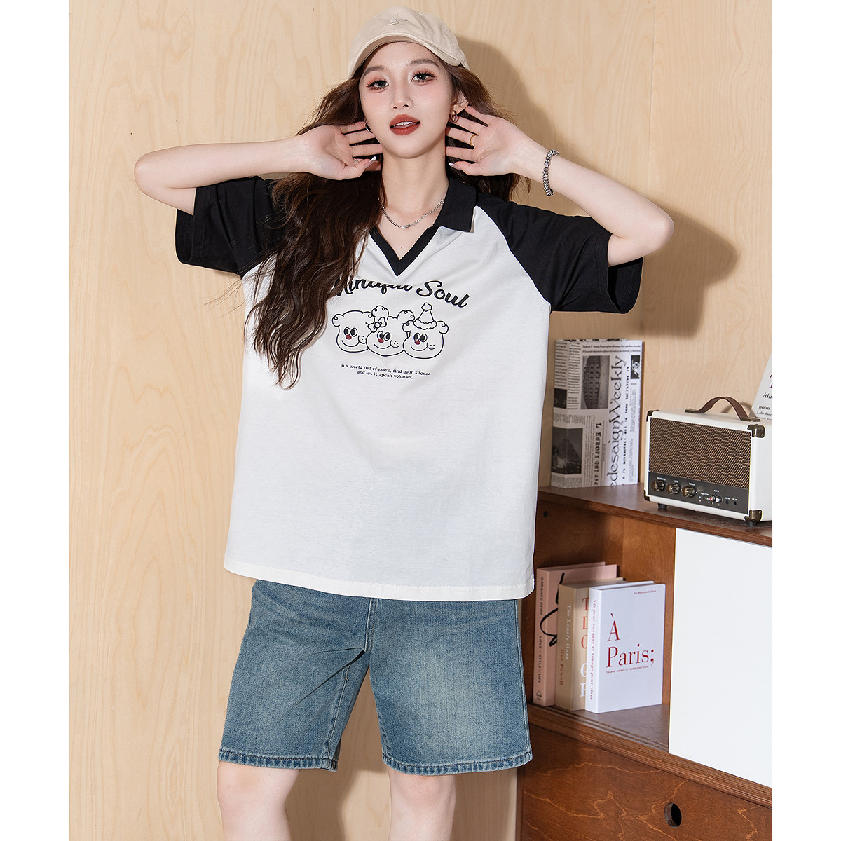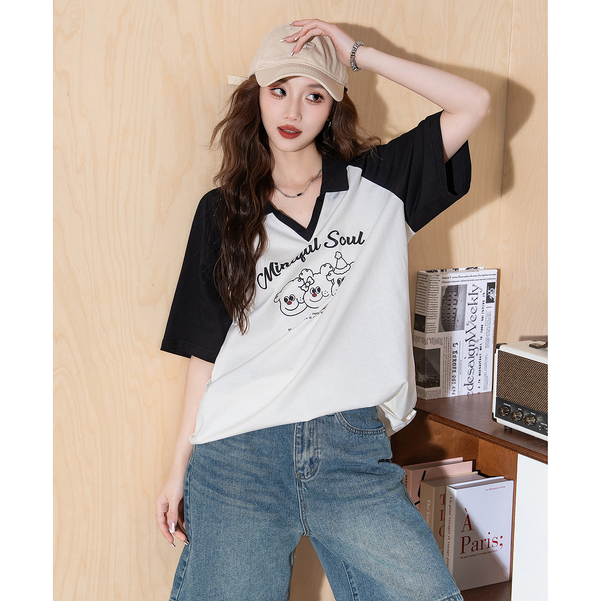 唐狮2025夏季新款短袖polo衫拼接撞色插肩袖女士学院风t恤ins上衣