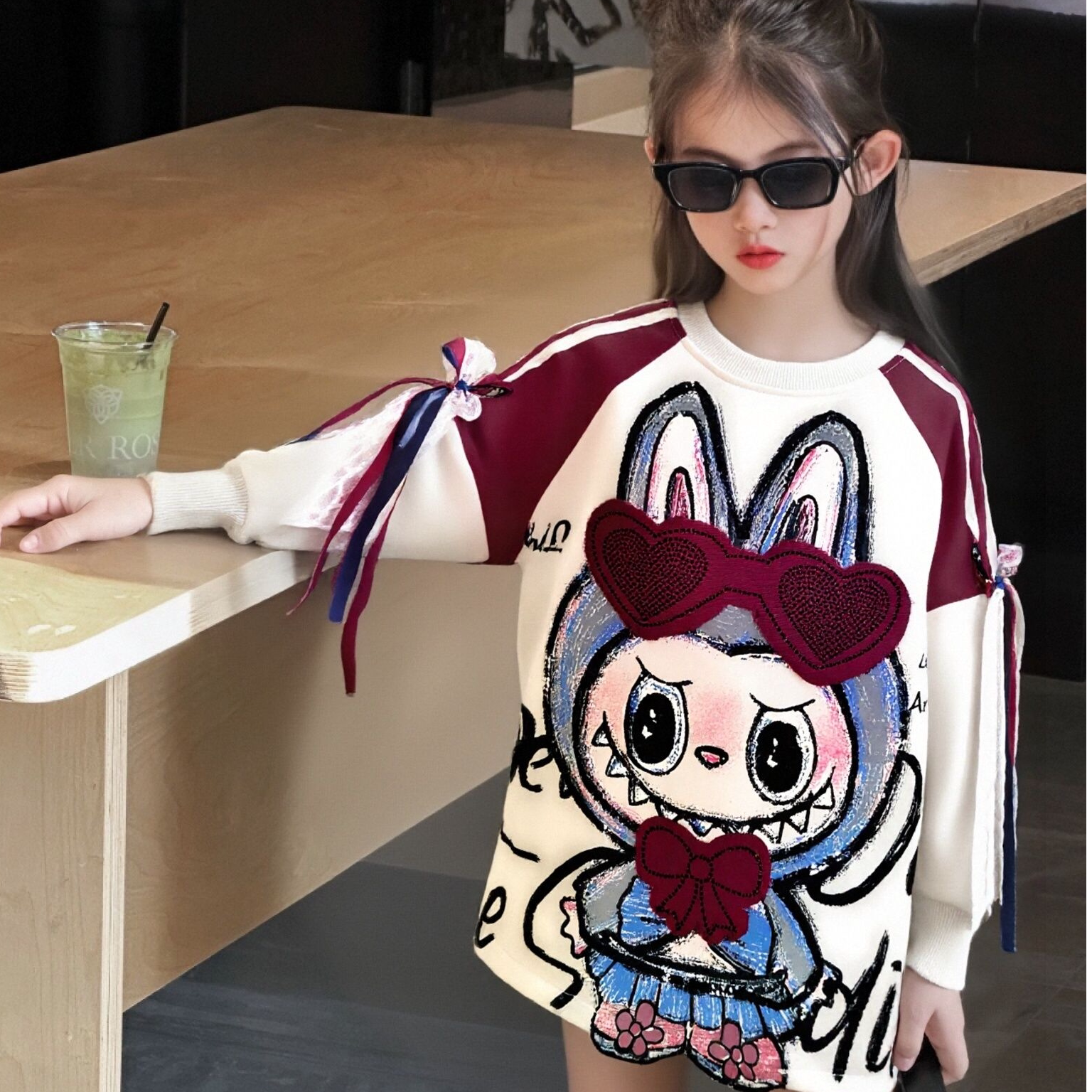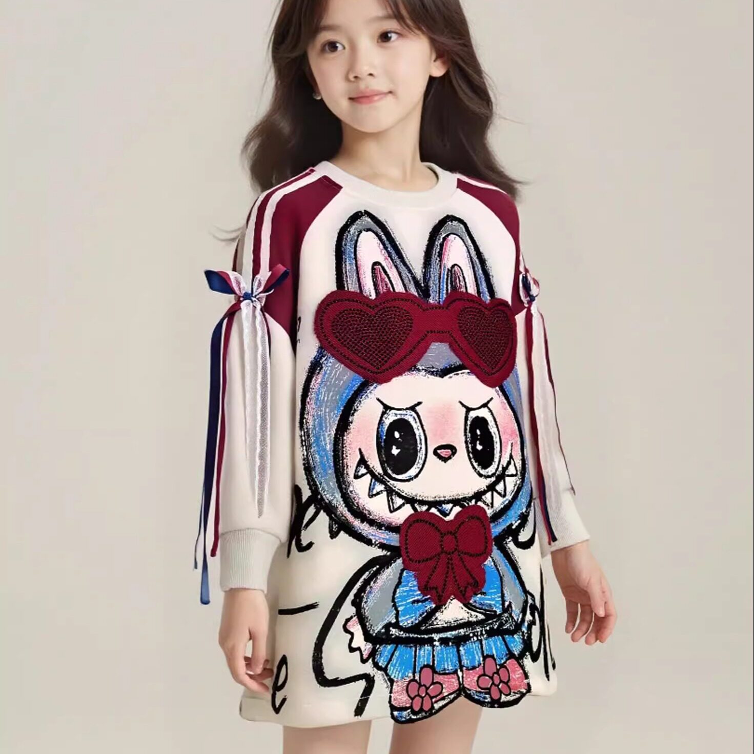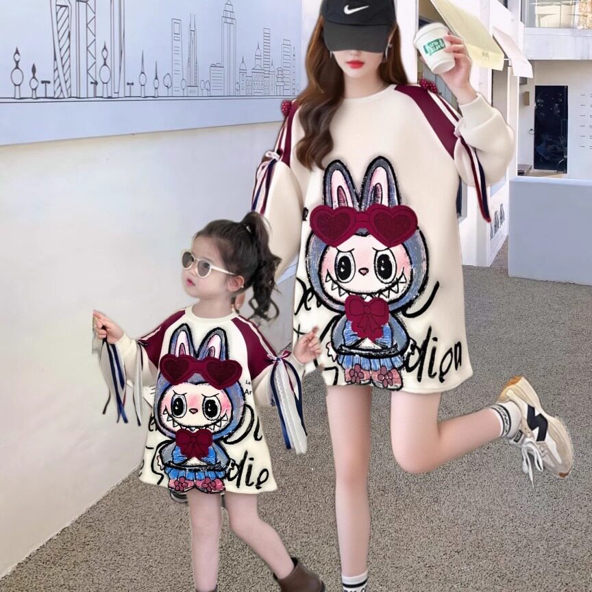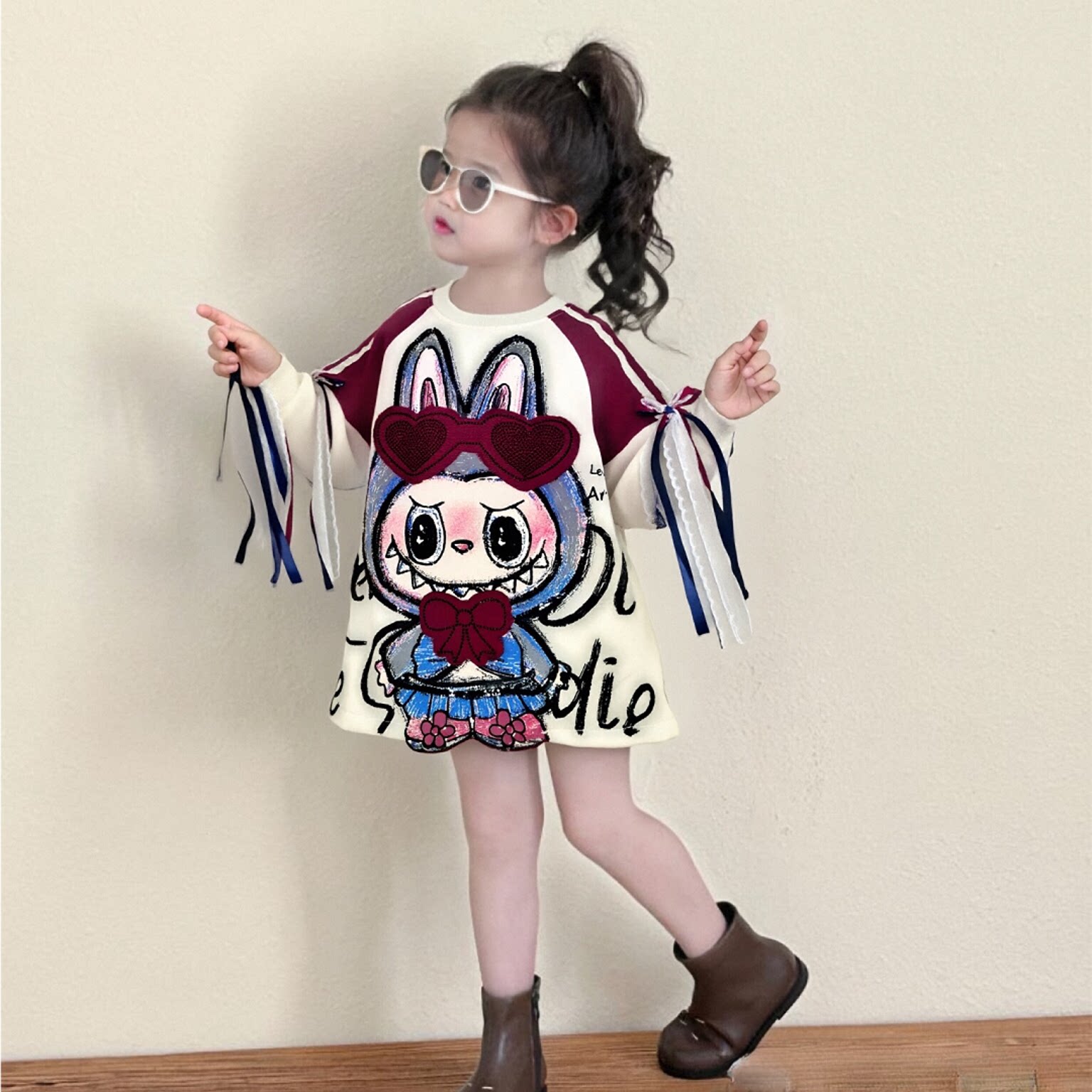 MN女童潮牌拉布布卫衣裙2026春秋新款时尚宝宝卡通连衣裙亲子装酷
