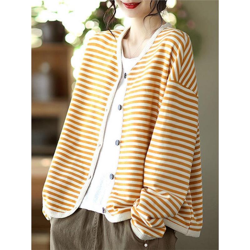柒白2025秋季新款简约文艺条纹拼接短外套女气质宽松长袖针织开衫