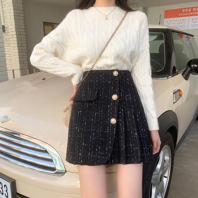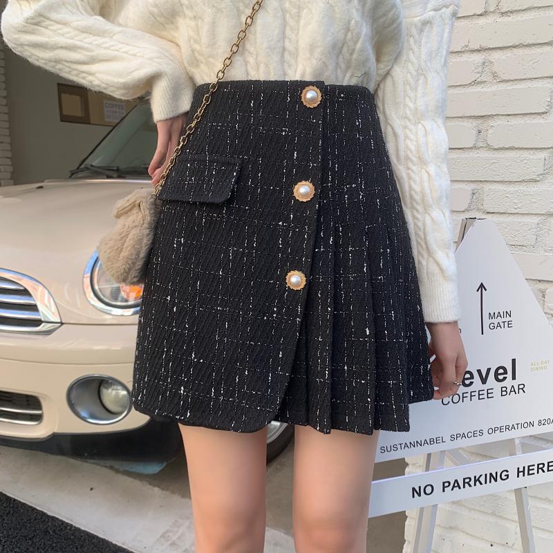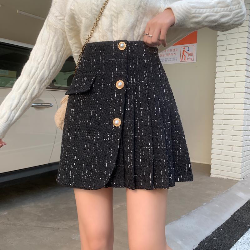 大码小香风毛呢百褶半身裙女冬设计感短裙胖mm高腰格子包臀a字裙