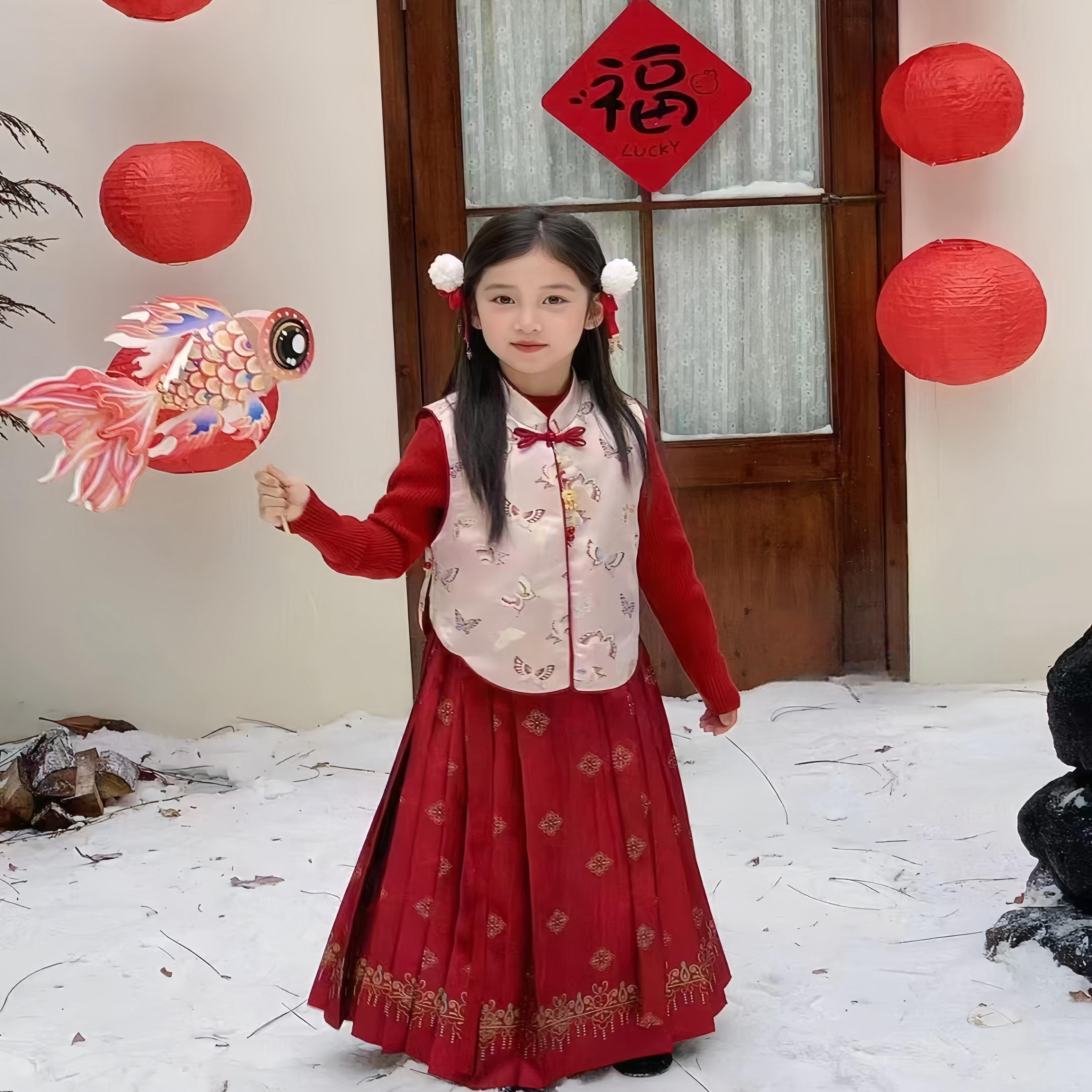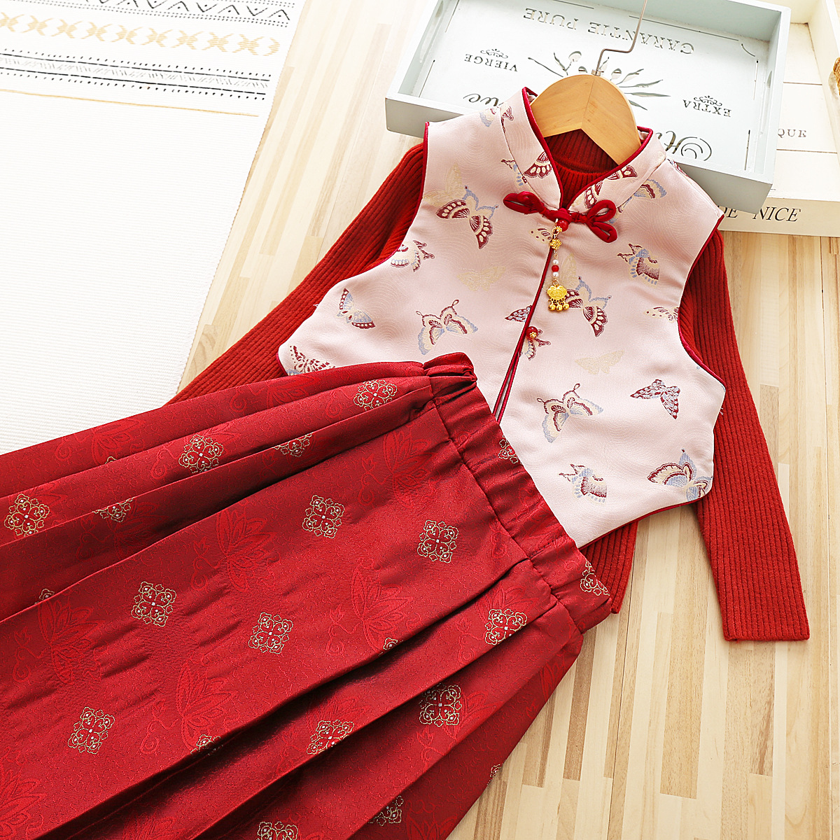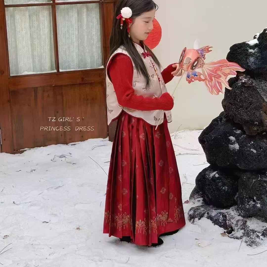 女童2025秋冬新款国风马甲套装儿童洋气拜年服公主裙新年三件套裙